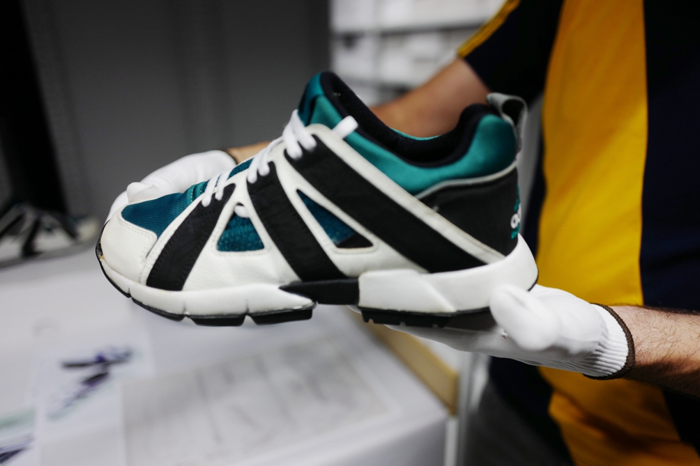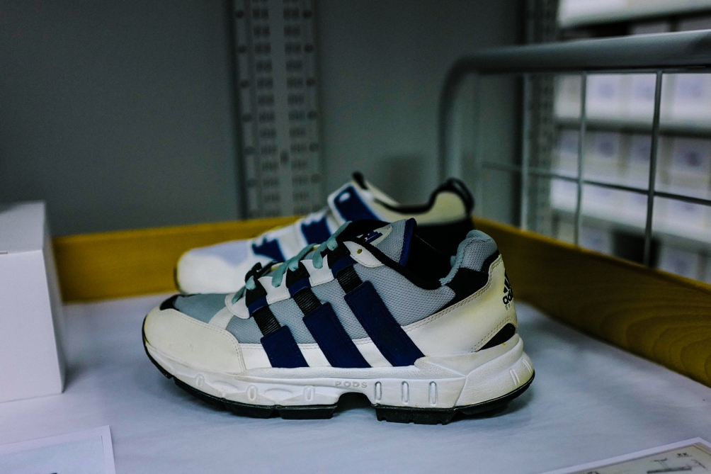 这两双你应该没见过吧?这是我们在阿迪达斯德国总部的 Archive 拍摄的 1995 年推出的 P.O.D (Point Of Deflection) 。 90 年初由阿迪达斯创意总监 Peter Moore (传奇设计师,代表作品从电子游戏到你我他都知道的Air Jordan 1,对,你没看错,那双改变了一切的篮球鞋) 开创的 EQT 产品线(Equipment 的缩写)代表了“只保留对功能性的追求,不需任何多余成分”的前卫理念。