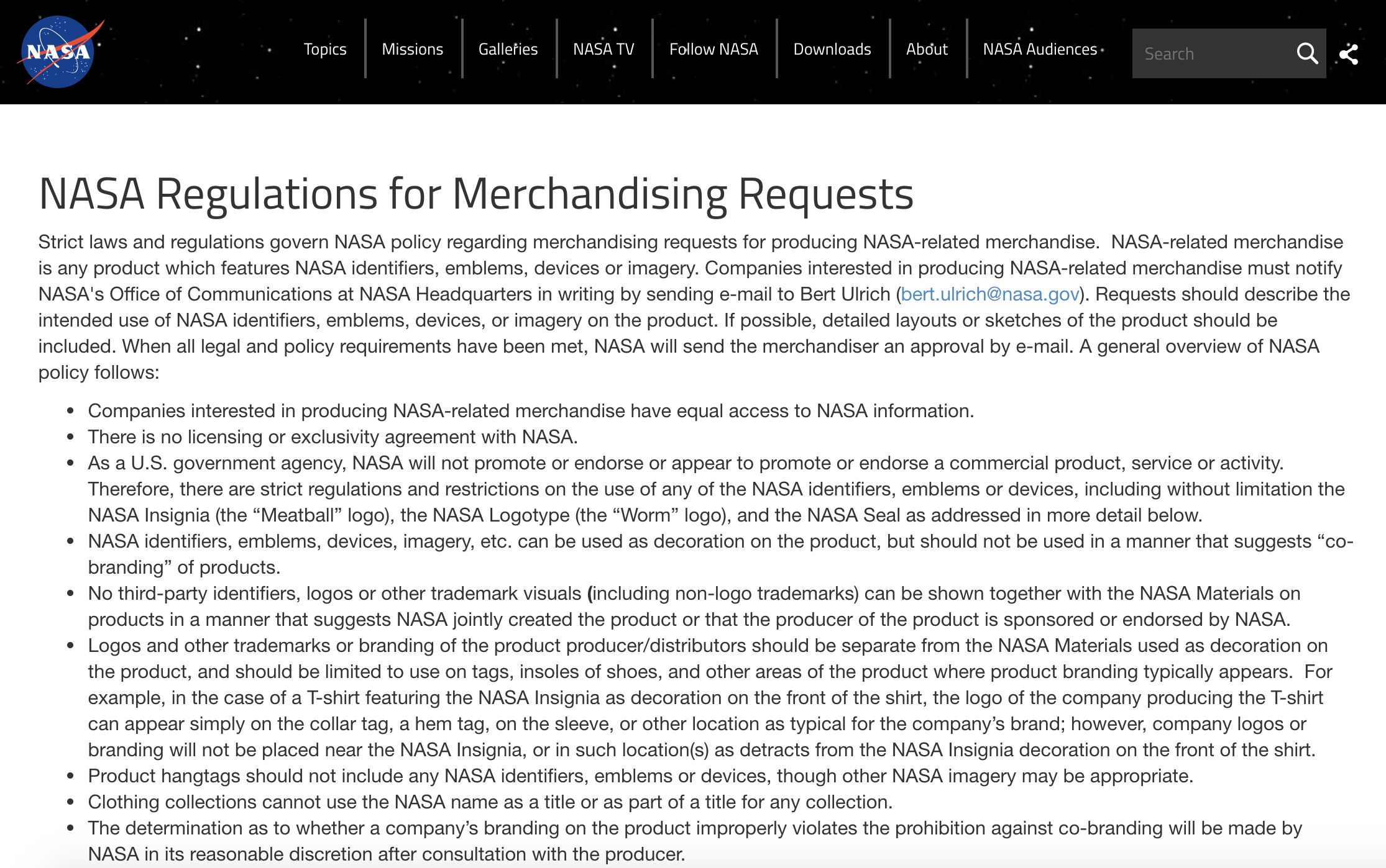 NASA 官方列出的周边合作细则,有想法的朋友可以去写邮件申请了,万一成了呢?! (图片来源:NASA)