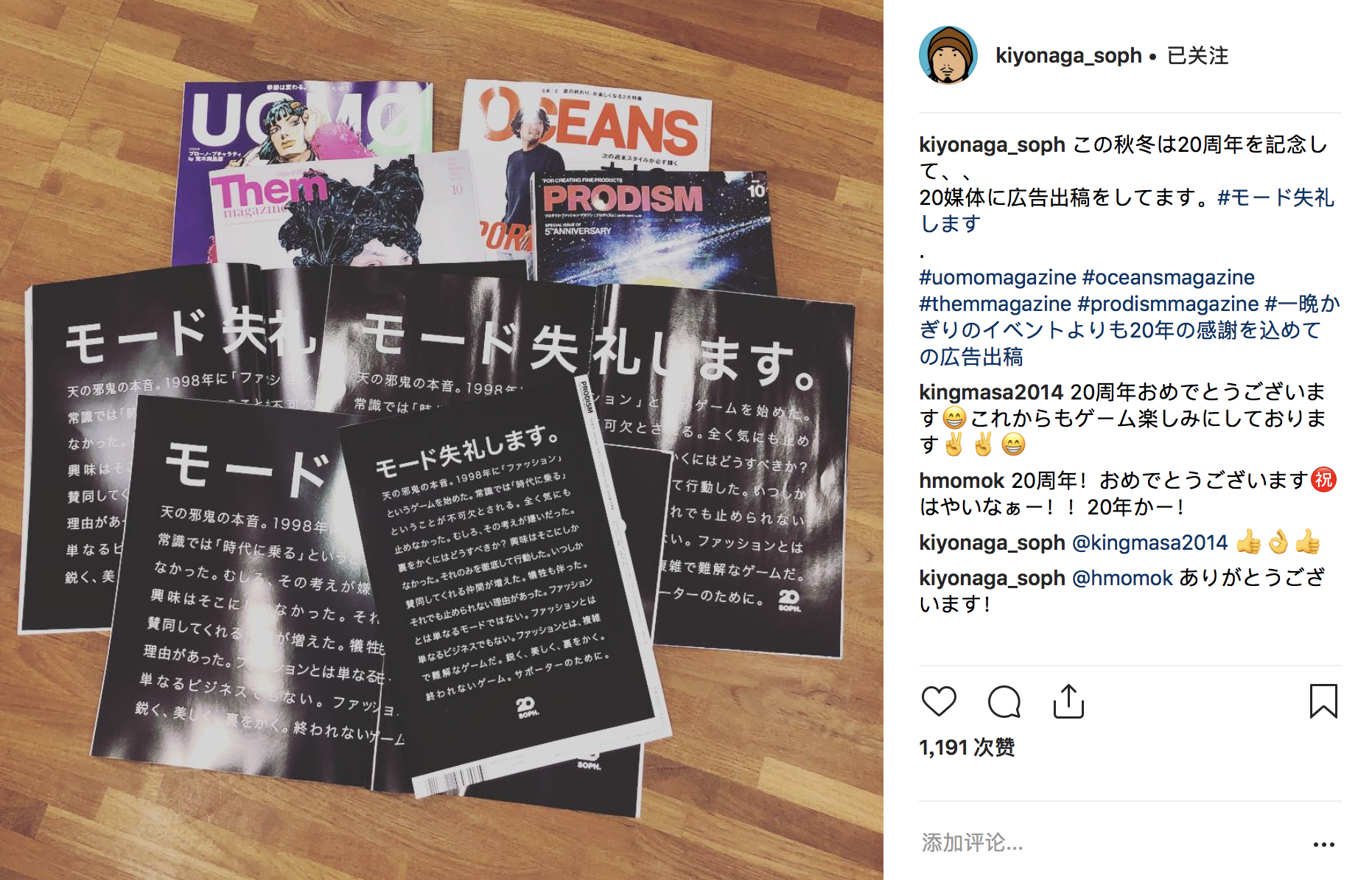 这是他最近一次在 Instagram 的分享(图片来源:@kiyonaga_soph)