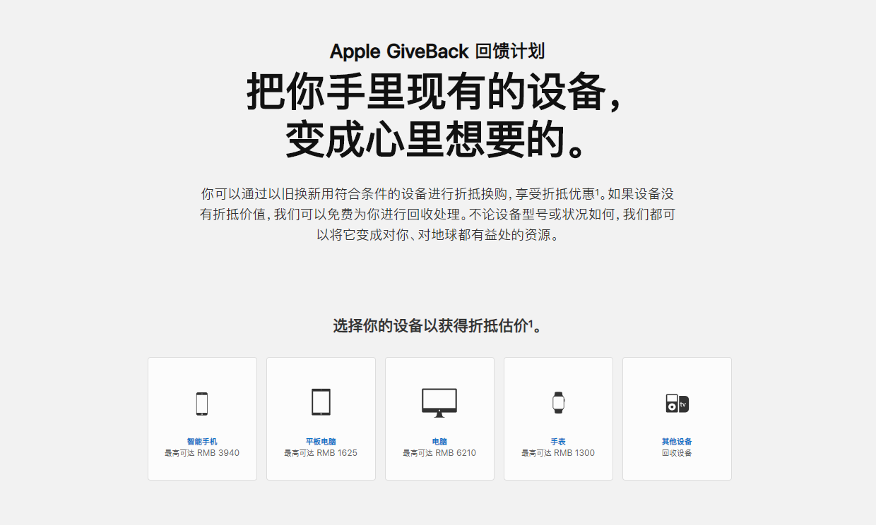Apple Giveback 以旧换新政策依旧管用,你可以将符合条件的设备折抵换购,享受优惠。如果设备没有折抵价值,Apple 会免费为你进行回收处理。不论设备型号或状况如何,这都是对消费者和地球环境一项有益的措施。你可以通过这项措施省下来不少钱。