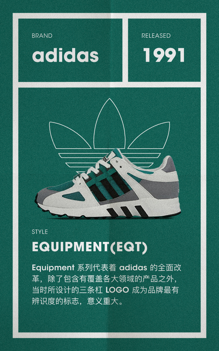 1991 年 adidas Originals 聘请了 Peter Moore 作为创意总监,打造全新的 EQT 系列,全称 adidas Originals EQUIPMENT。Moore 那时已经从 Nike 离职,正是他一手打造了 Air Jordan I 以及 Jumpman飞翼 Logo,这两个设计在球鞋史上的重要性我就不用和大家再说了吧?