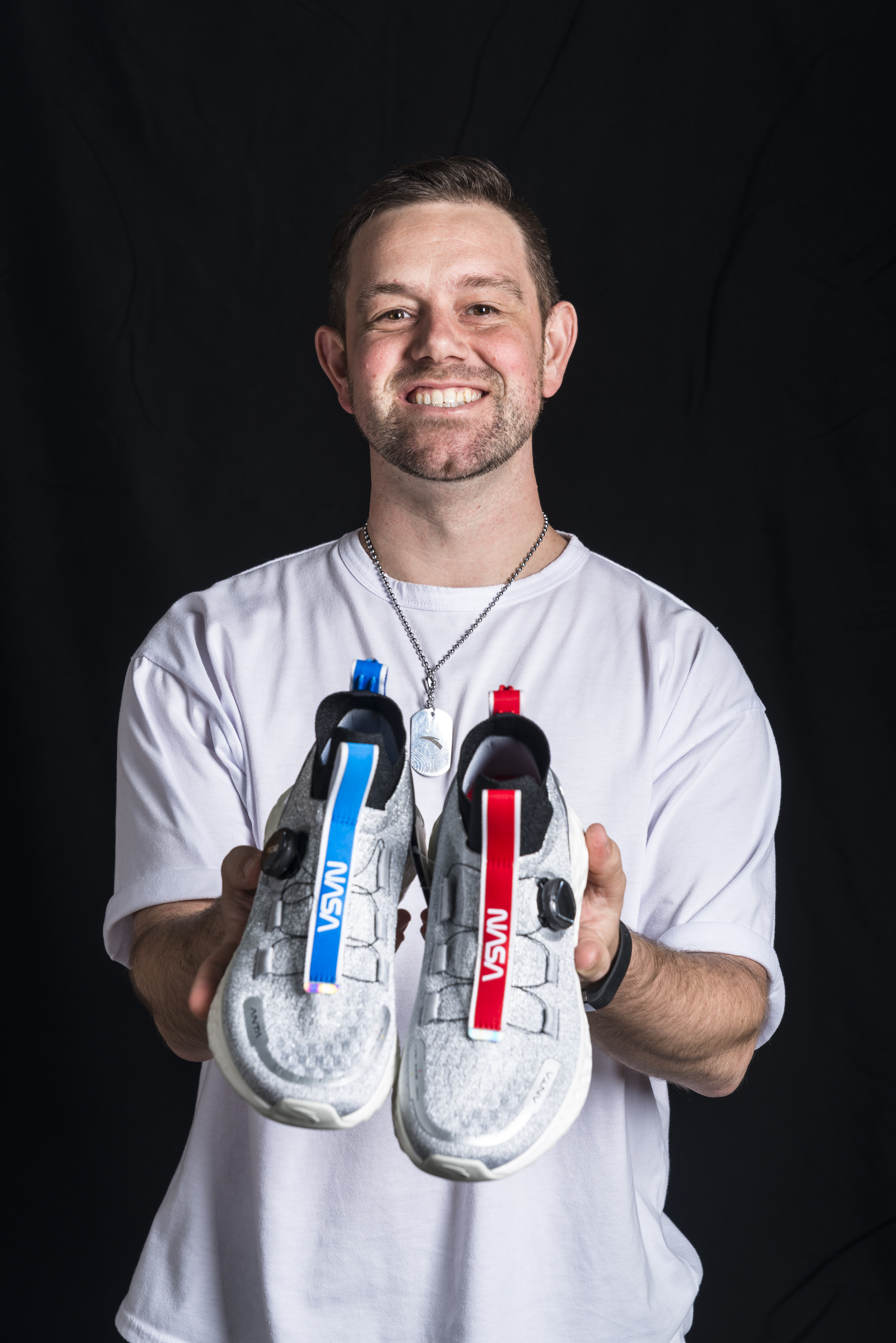 对于这次合作鞋款的第一眼印象,Issac 认为设计上更加符合 NASA 在他心目中的形象,“整双鞋亮眼的银色飞织鞋面让人马上就联想到太空服质感,左右不对称的红蓝织带更是非常具有 NASA 辨识度的设计巧思。”取代传统鞋带的 BOA 无繫带系统,也让他感到上脚流程更加简化了,“鞋身包裹度可随心调整非常便利,存在感很高的旋钮设计构成令人过目难忘的抢眼外观,说实在话,单就搭配性来说肯定是一双相当易于穿搭的鞋款!”
