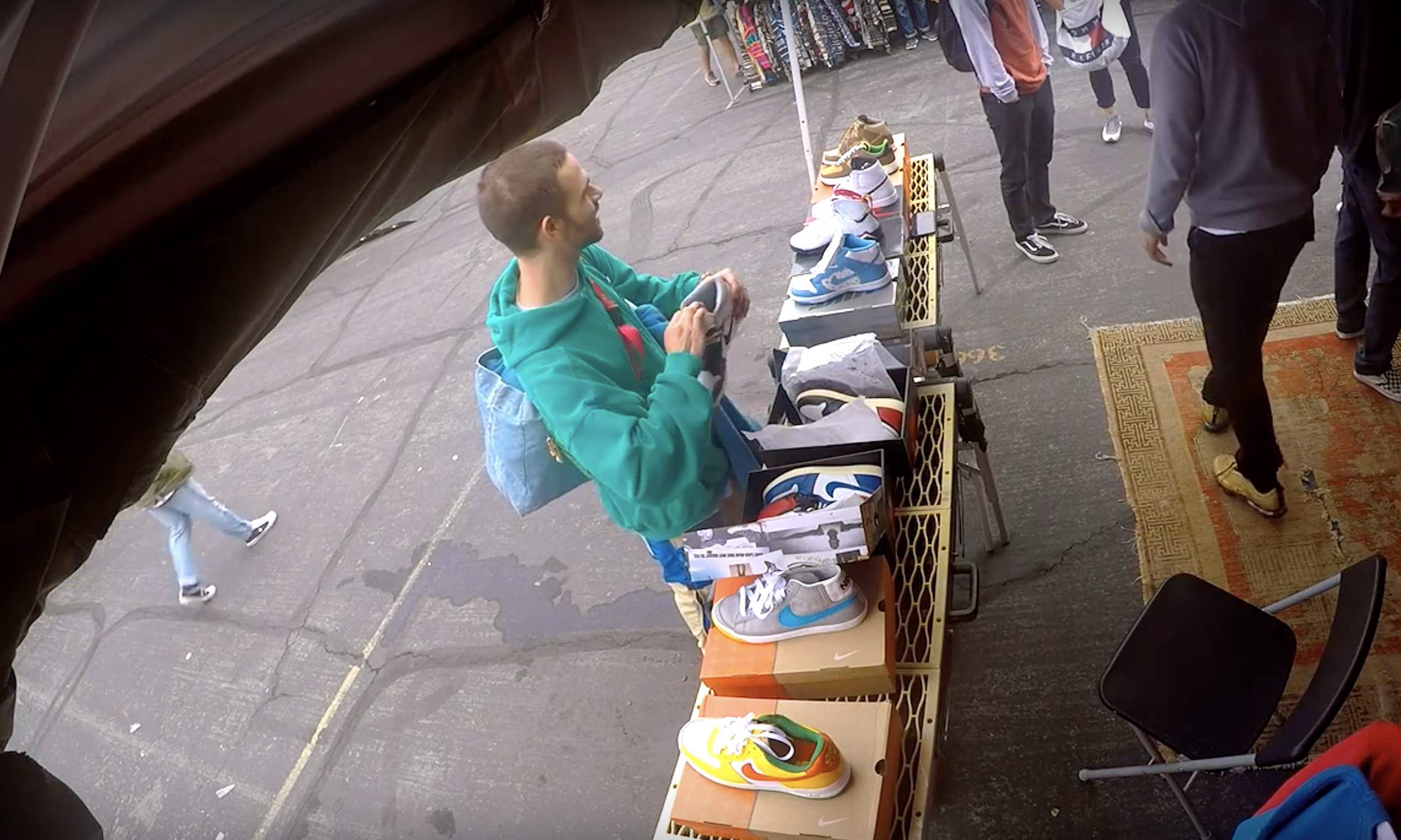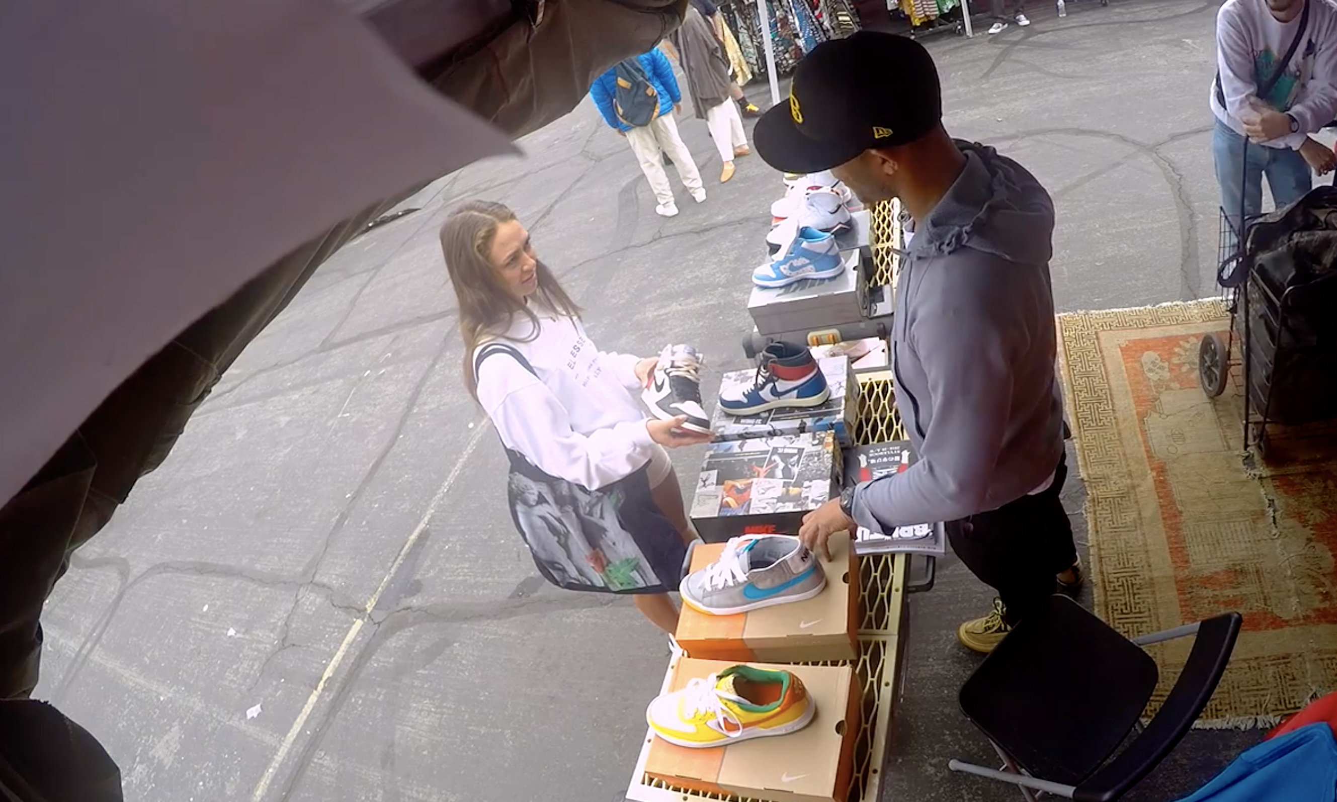 这种地方普通人哪能想到会有 “狠货” 出现啊?然而这双炙手可热的 Union x Air Jordan I 就被堂而皇之的摆在摊位上,并且售价仅为 80 美元…就算摸起来质感再好,只卖 80 美元的 “正品” Air Jordan I 也是难免让人有点“怀疑人生”。摊位上除了这双 Union x Air Jordan I,还摆了一些复古的 Nike、 Jordan 单品。品牌甚至还找来 Sean Wotherspoon 和 Emily Oberg 配合表演,也不知道因此错过这双鞋的顾客知道真相后该有多懊悔。