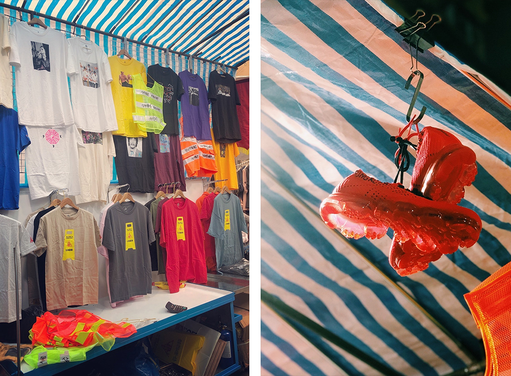 “女人街” 其实就是旺角的通菜街,作为香港的著名景点,这里直到现在仍然采用传统的档口经营模式;贩售的东西主打 “物美价廉”,简单来说就是假名牌。嗯,跟小时候逛的集市很相似。而 4PK 在这里的 Pop-Up,也很好地模仿了周围各种摊位的氛围,打眼一看就像是 “卖假货” 的。至于说为什么要在 “女人街” 摆摊,MC仁和厨房仔说是想要看看外国人来到 “女人街” 这个盛产假货的地方,会抱着什么态度去看真品。
