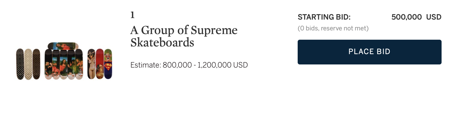 不过在这之前,Supreme 到目前为止还并不能算是 “倒闭”,这次的藏品能够吸引 Sotheby’s 这样的拍卖界巨头前来寻求合作就是最好的证明,它仍然是全世界最吸引眼球的品牌,说到这…我不免好奇起来这套迄今为止最为完整的板面藏品到底能拍到一个怎样的价格?