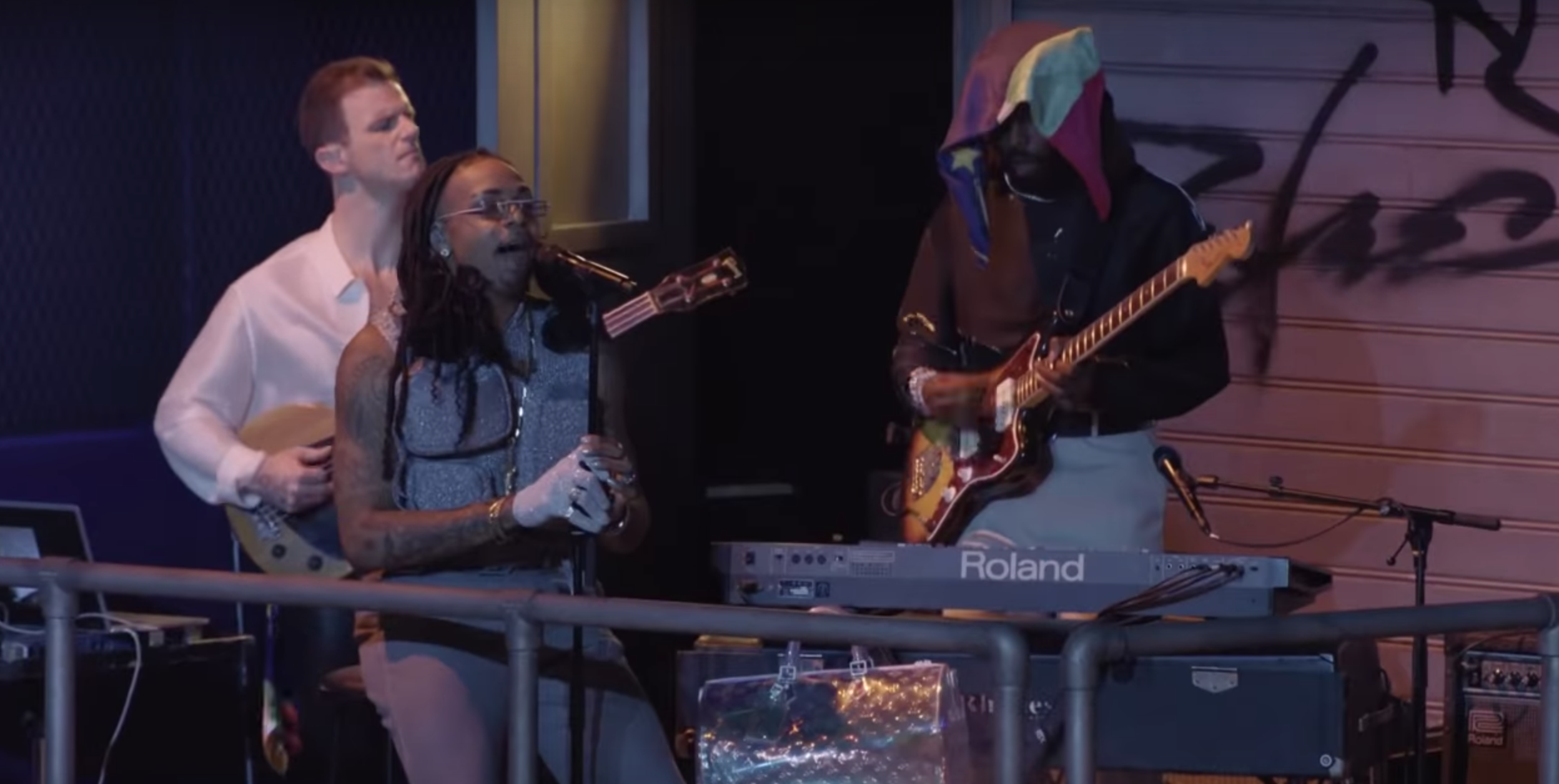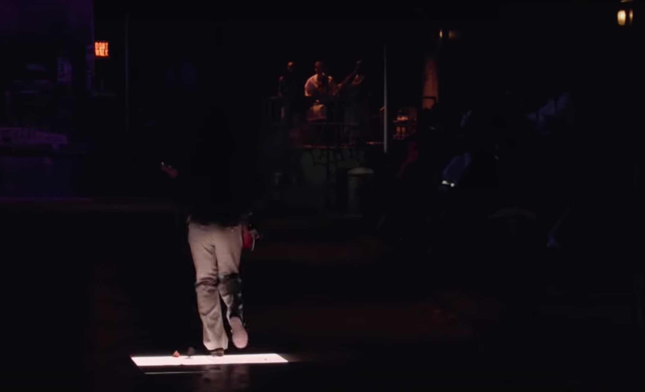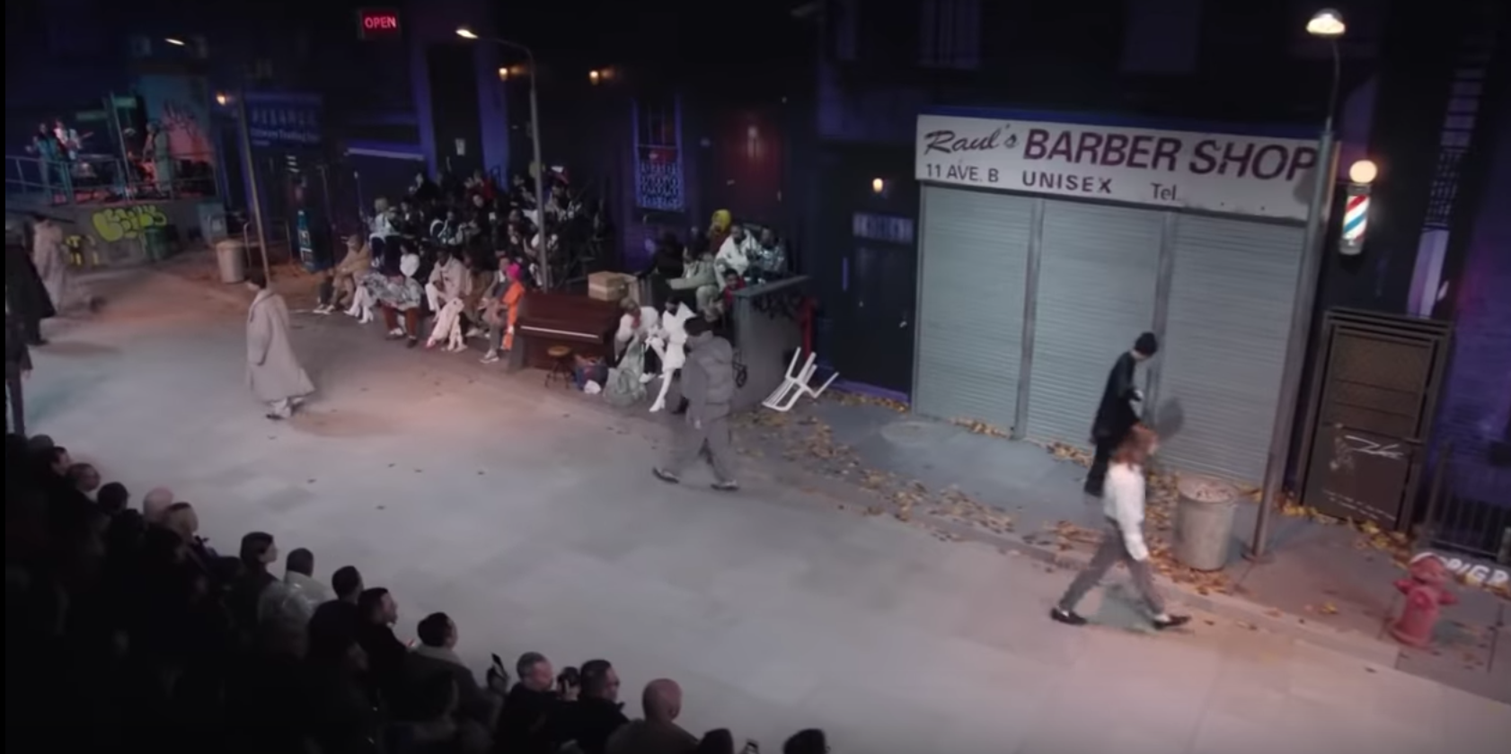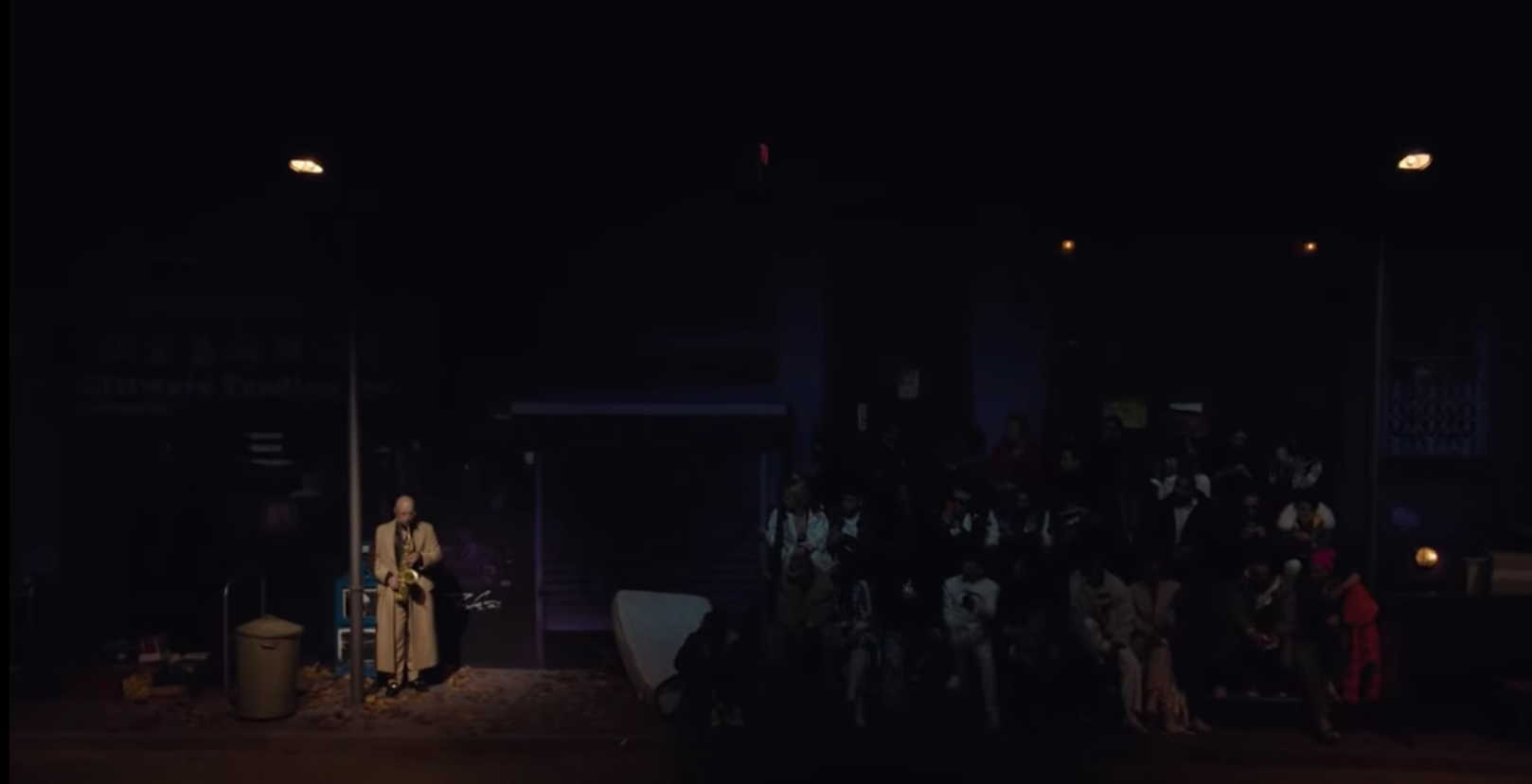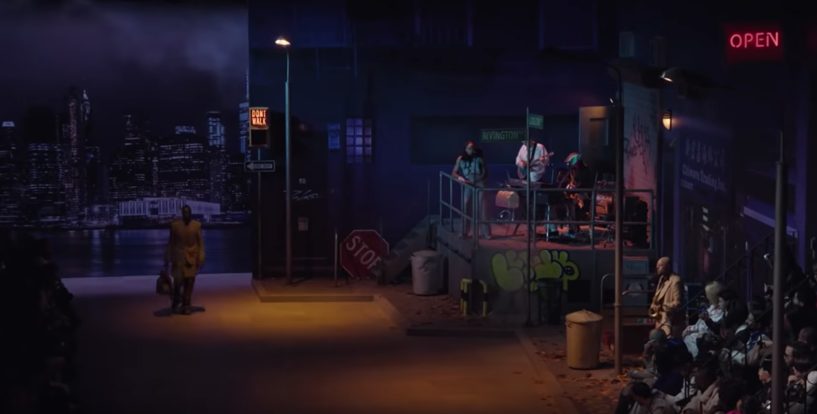 接着,照明聚焦在穿着驼色 Chesterfield 外套的萨克斯风手 Jason Arce 身上,他奏着带有忧伤孤独感的乐曲,灯光缓缓照亮场内空间,现场复制了纽约街道的形象 — 准确来说,是在市中心 Ludlow 与 Rivington 街的交叉口,后边是理发店、中文招牌的杂货铺,路边有着消防栓、垃圾桶与交通标志,落叶被微风吹起。