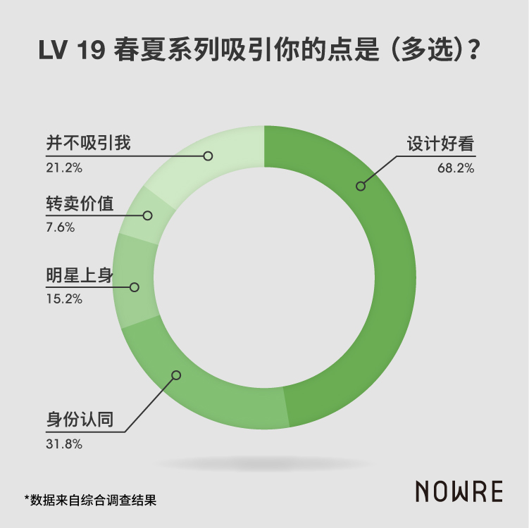 不过不可争议的一点是,大部分人认为 Virgil 的 LV 首秀是好看的。在 104 份样本中,接近 68% 的人认为这次系列最吸引人的点是因为 “设计好看”。但是光凭 “好看” 这两个字并不足以形成购买的原因,“奢侈品牌的身份认同感” 也占了非常重要的因素,毕竟好看的衣服千千万,叫 LV 的可只有一个。