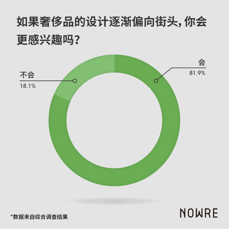 现在逐渐偏向街头的奢侈品牌也不止 LV 一家,Dior、Burberry 等传统时装屋都在走向街头,展现出年轻化的趋势。既然想要年轻化,就要注定会失去一些老客户,鉴于这次接受访问的年轻人样本占大多数,能够接受奢侈品牌走向街头化的比例达到了 82%。