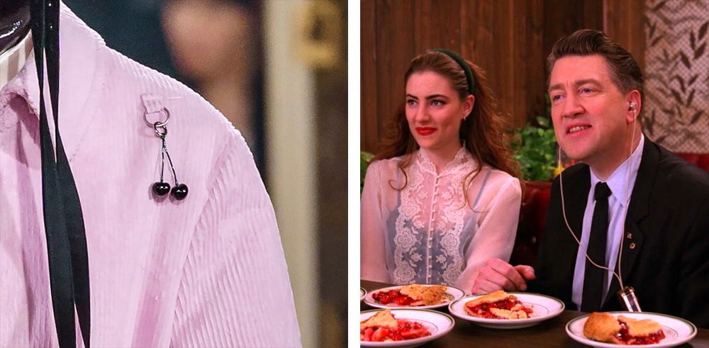 DIY 文化与高级时装的相遇,是 Raf Simons 认为当下流行文化中不能或缺的新元素 。在设计中,落地及踝的超长大衣上,依稀可见附带着 D 形垂环,可肆意添挂自己喜欢的配饰。林奇《双峰》中的不少线索,也被 Simons 把玩着用到了细节上:灼烧至半边儿的项链、Double R 餐厅樱桃派原料车厘子、还有助波推澜的蓝玫瑰……都化身成为悬挂在垂环上的装饰吊坠。
