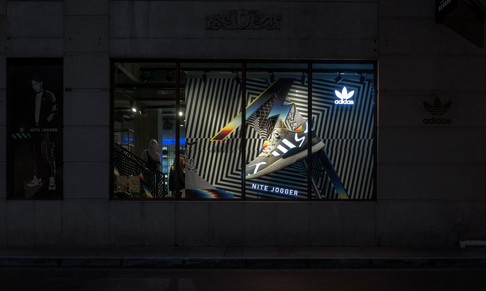 如果你逛得足够仔细,就会发现,这次三里屯太古里南北区之间的狭长街道也被 Nite Jogger 霸气“包揽”。整个街体都绘制成了活动的主题印花,Felipe 色彩鲜明的艺术创作和巨大的 Nite Jogger 鞋身一览无遗。你甚至能看清鞋子上的 BOOST™ 颗粒细节。
