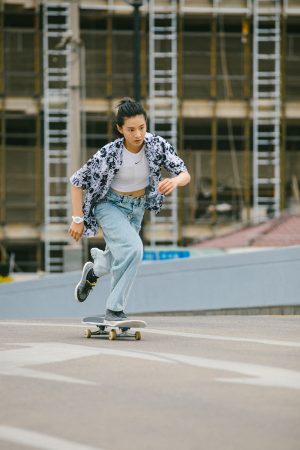 滑板好像在别人眼里就不是女生的运动,但自从邱明 20 岁那年第一次在一家服装店看到滑板,就大胆尝试了一下,之后便爱上了这个运动。在练习过程中受过无数伤,甚至是骨折,但即使是这样也没有动摇她对滑板的热爱。谁规定滑板只有男生才可以玩?只要热爱,尽管去做。