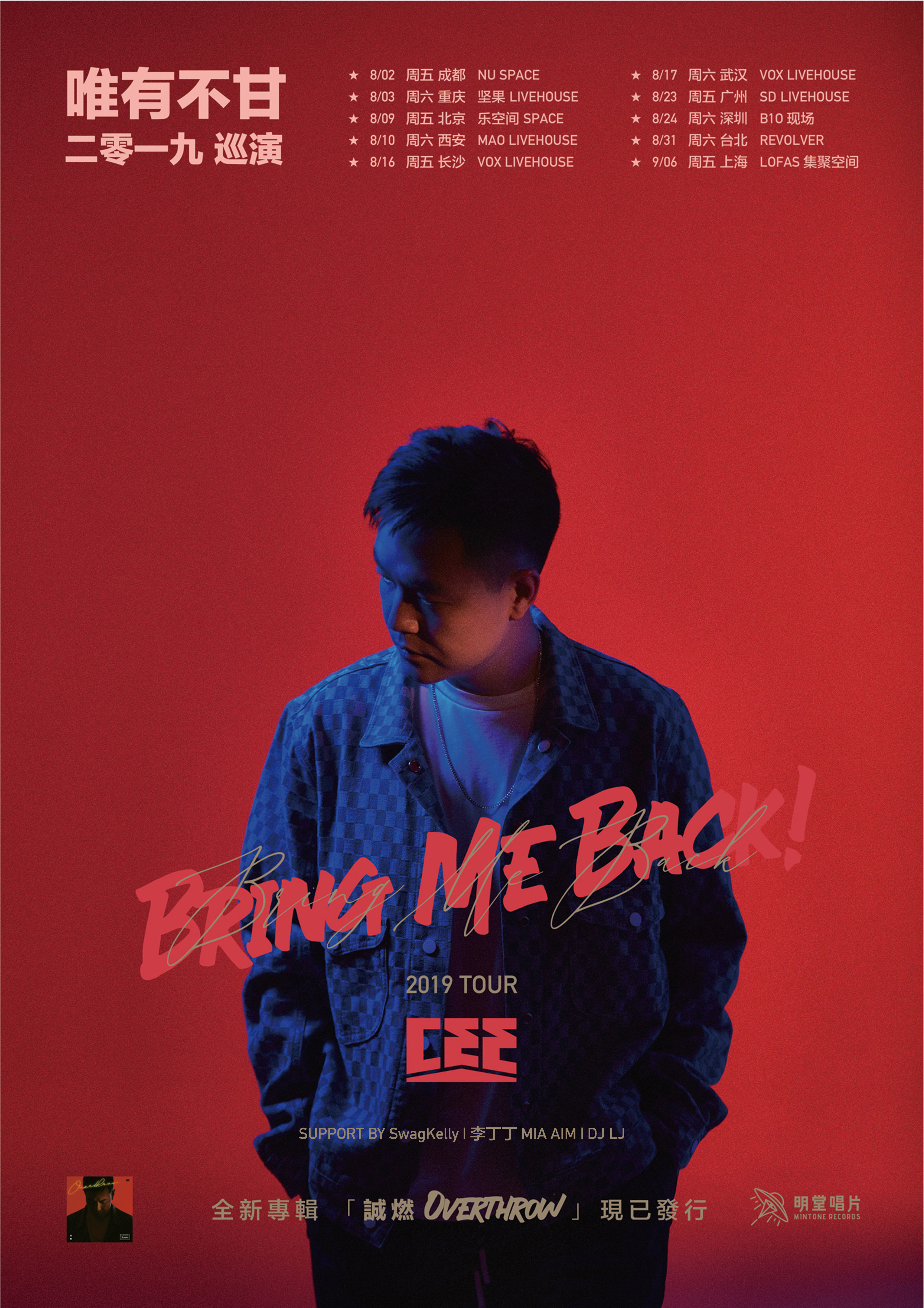 除了此次的新专辑之外,Cee 还将于 8 月 2 日起正式开启 “唯有不甘” 2019 巡演,现已在秀动上开启预售。巡演首站将于成都起跑,之后会前往北京、西安、广州、上海等地,伴随出演的嘉宾包括 Lu1、功夫胖、AR 刘夫阳、阿克江等人。