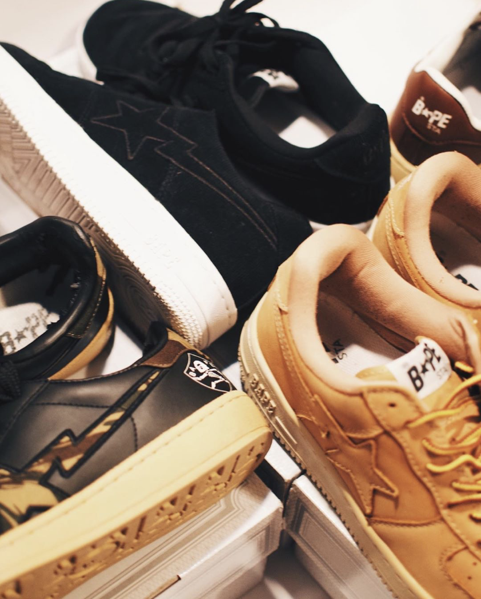 这些年间一些 BAPESTA 在配色上也做足了功夫,比如上面从 Air Jordan 系列、Red Brick Sole(红砖色雕花鞋) 和 Red Wing 靴子汲取过来的配色玩法,尽管没有什么联名的名堂,但也相当特别。