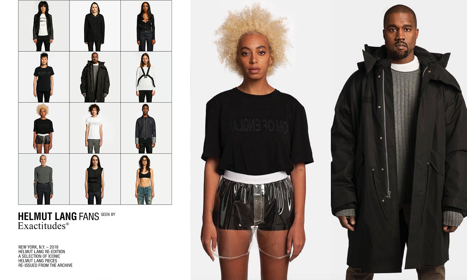 曾经的前卫造就了今日的经典。但经典的再现总与时代的流行密不可分。Rihanna、Kanye West、Solange Knowles 也都是 Lang 的忠实信徒。Kanye West 不断地向人们诉说他对 Lang 的情有独钟,他的 Yeezy 系列也从中获得启发。专注于记录亚文化群体的 Exactitudes 曾经拍摄过一组关于 Helmut Lang 簇拥者的照片,其中就包括歌手 Solange Knowles 和 Kanye West,而这些音乐界的翘楚对时尚流行的推动有着不可小