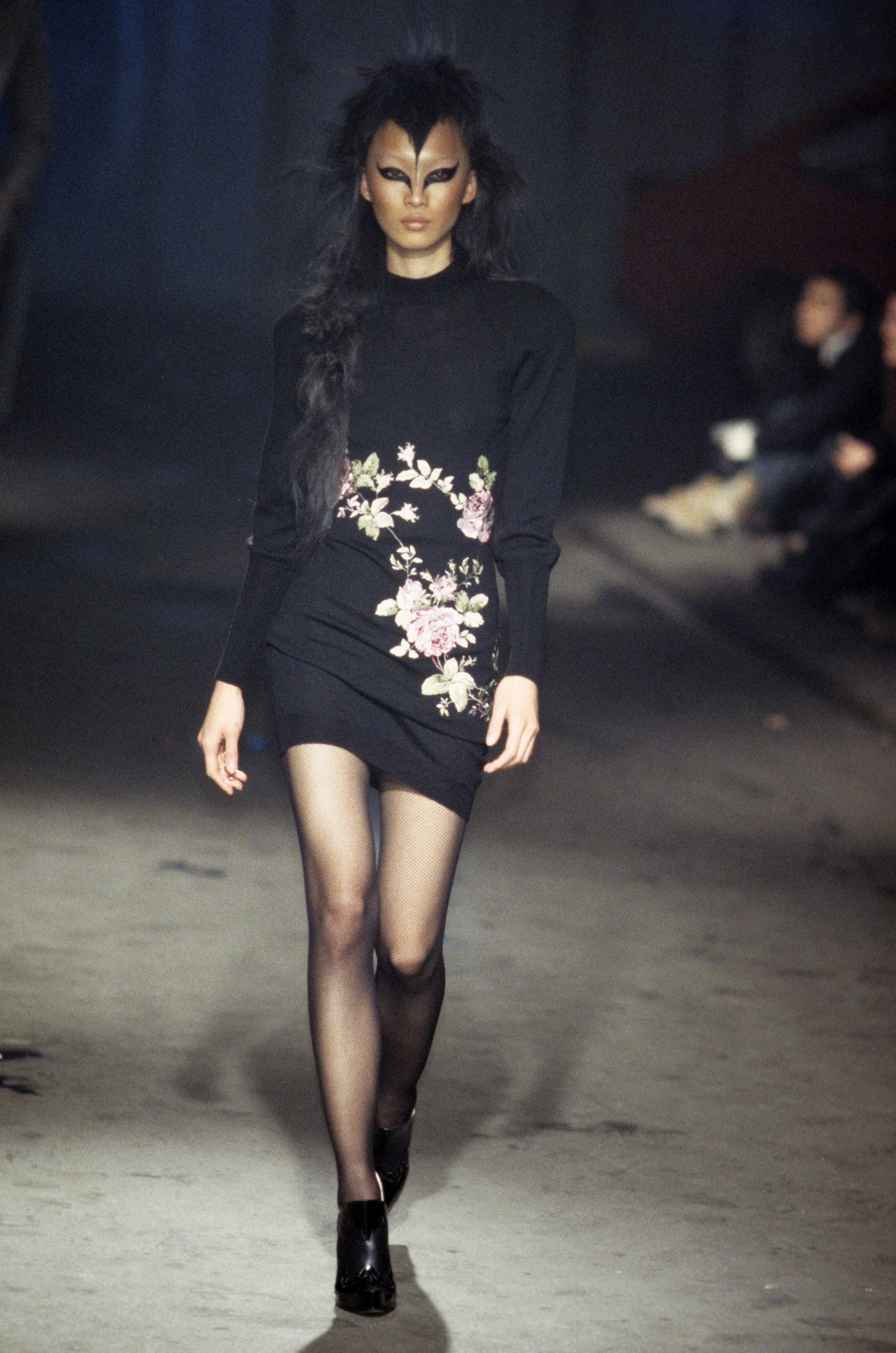 一些不被允许进入的学生,冲破路障,踢倒了火盆,场地边没有被放空汽油的废旧汽车因此着火,这是 McQueen 专为系列而准备的废置汽车。然而每个人都认为这是秀场展示的一部分,模特就这样一个接一个继续地出场,与着火的汽车仅有不到一米之隔,所幸的是,好在保安及时发现并用灭火器扑灭。这一幕略有些惊恐的插曲为 1997 秋冬系列的疯狂与经典再度加注了砝码。