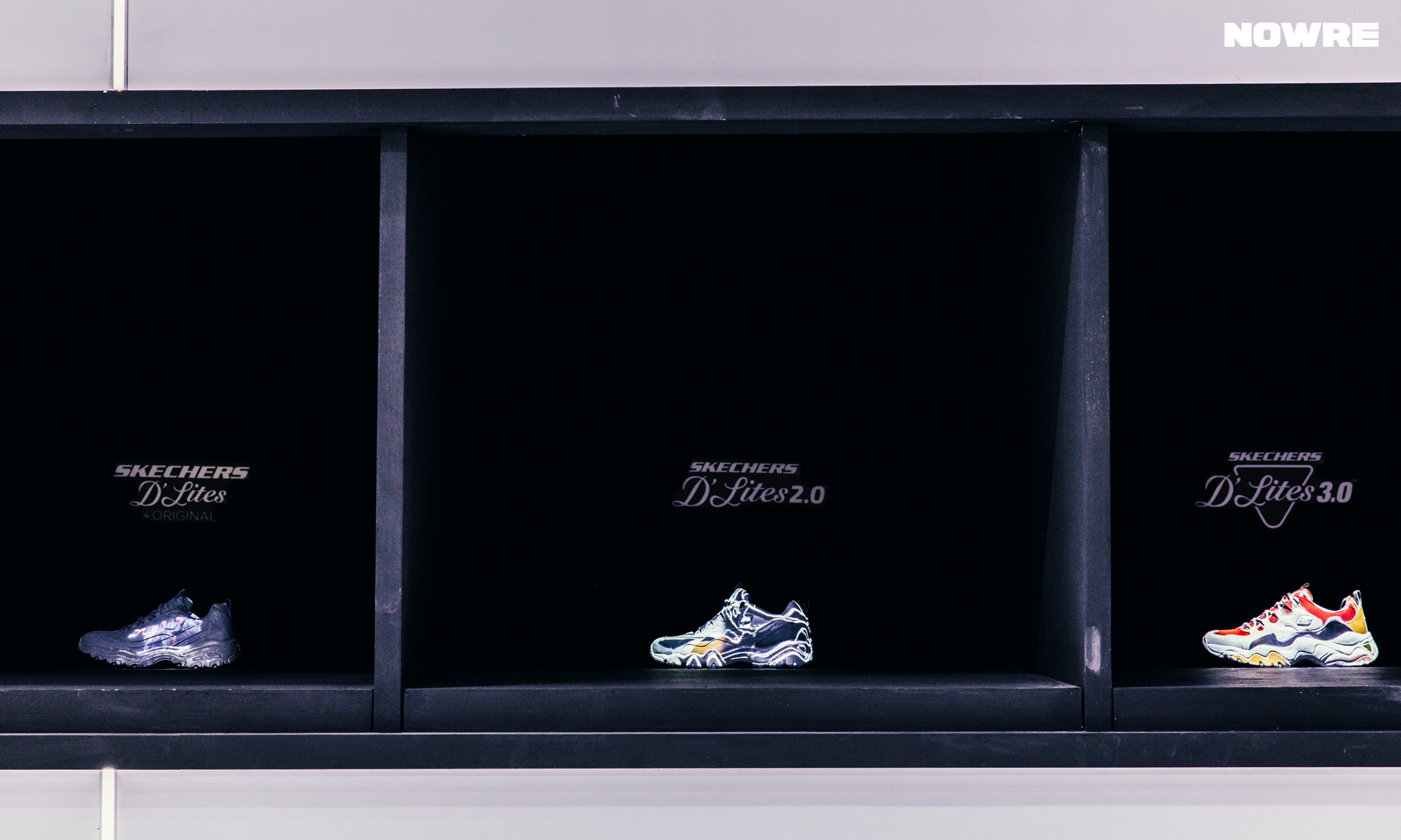 首先,我们先说 D’Lites。斯凯奇此次在 Sneaker Con 广州站上的做法可以说是既讨巧又贴题,缘由是其分别设置了三个由 9 块电子屏幕组合而成的电子装置,然后将 D’Lites 1-3 代鞋款分别置入其中,以投射在鞋款之上的不同光纹来展现 D’Lites 鞋款的多样性。