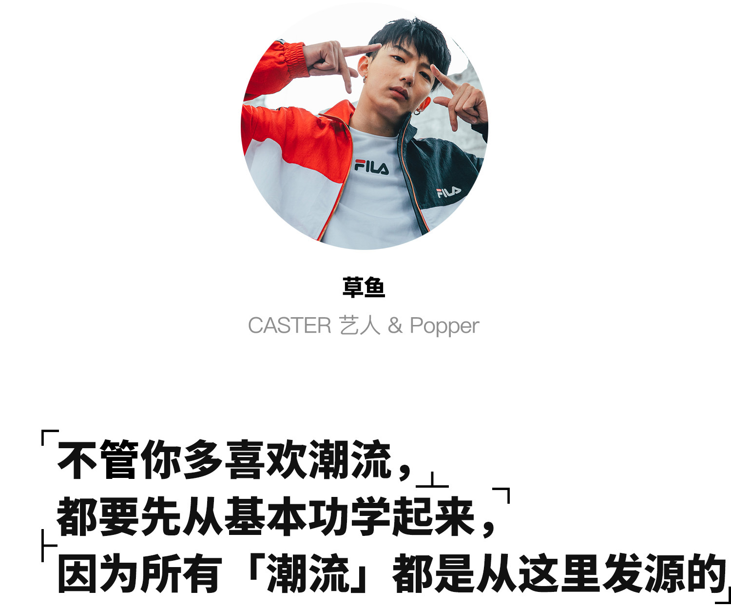 届时,素来以潮流街头文化为主导的 FILA FUSION 便推出全新  「HERITAGE」街头系列,同时还邀请到国内知名 Popper 草鱼,「回到街头」上身演绎本季单品。借此机会,他也跟我们分享了关于他的街舞历程及穿搭心得。