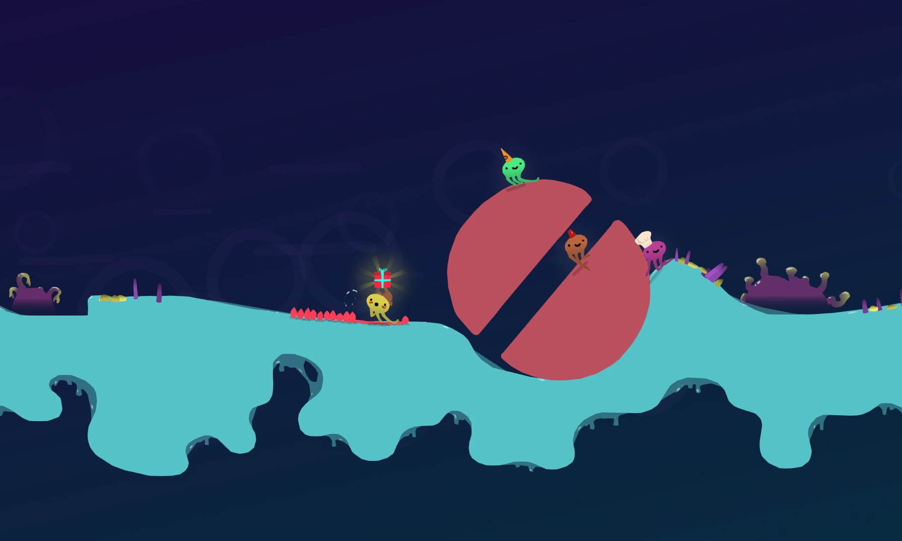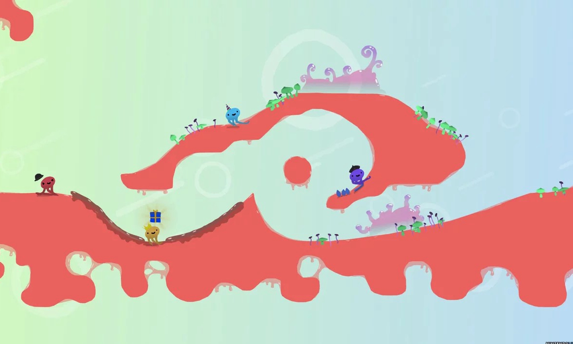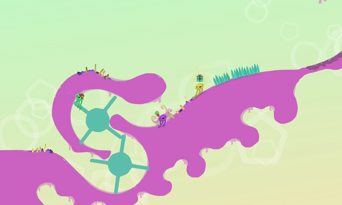 在横版过关的竞技游戏中,除了《雷曼:传奇》系列与《超级马里奥》的经典 2D 画风之外,更有许多以略显清新的画面设定而见长的闯关游戏,《Muddledash》(混乱快跑)则是其中之一。这款游戏的内部世界架构称不上庞大,其定位则是一款侧重休闲游戏体验的小游戏。玩家在游戏内扮演不同的「小章鱼」角色,并在光怪陆离的赛道中竞速,最终抢到「礼物」并到达终点的即为赢家。