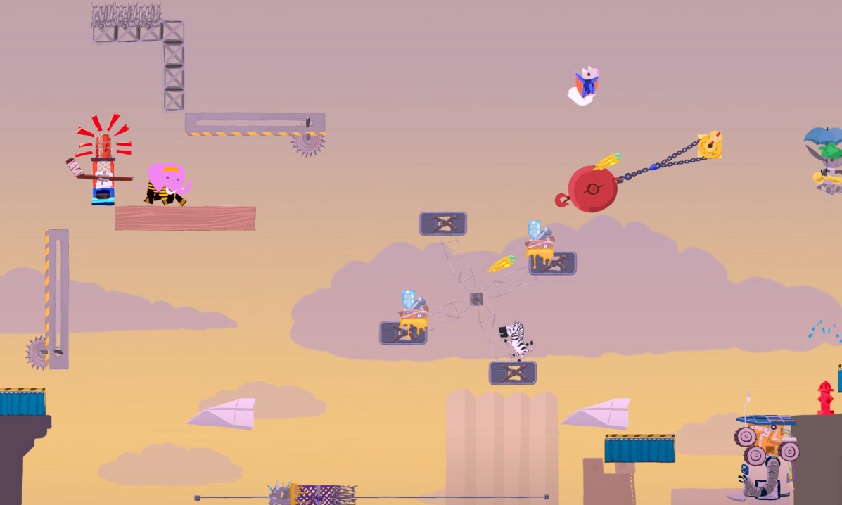 简单理解的话,《终极鸡马》可以被看做:手动建造类似《超级马里奥》中的游戏关卡,并让你的互动玩家尝试通关,对于玩家的创造能力与破局能力都有着相当大的考验。如果要认真地来一局《终极鸡马》,会十分考验大家的急智。 同时,《终极鸡马》的局内画面以十分经典的 2D 建模呈现,扮演可爱的动物角色也能够令原本激烈的「对决」氛围更加轻松。