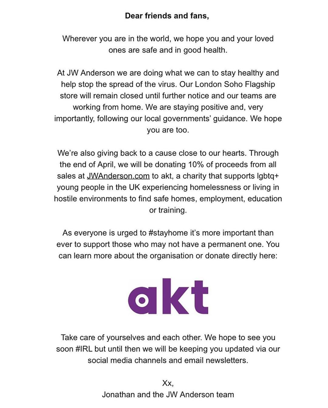 而在 3 月 26 日,面对全球性爆发的新冠疫情,JW ANDERSON 再次向 LGBTQ+ 群体伸出援手。品牌在官方 Instagram 平台宣布,将把所有在线销售收入的 10% 捐赠给非营利组织 Akt,这是一家以 LGBTQ +青少年为中心的英国慈善机构,由 Cath Hall 于 1989 年在曼彻斯特成立。三十余年来,Akt 一直致力于为 LGBTQ+ 16-25 岁的年轻人提供支持,帮助他们找到住房以及就业、教育或培训的机会。