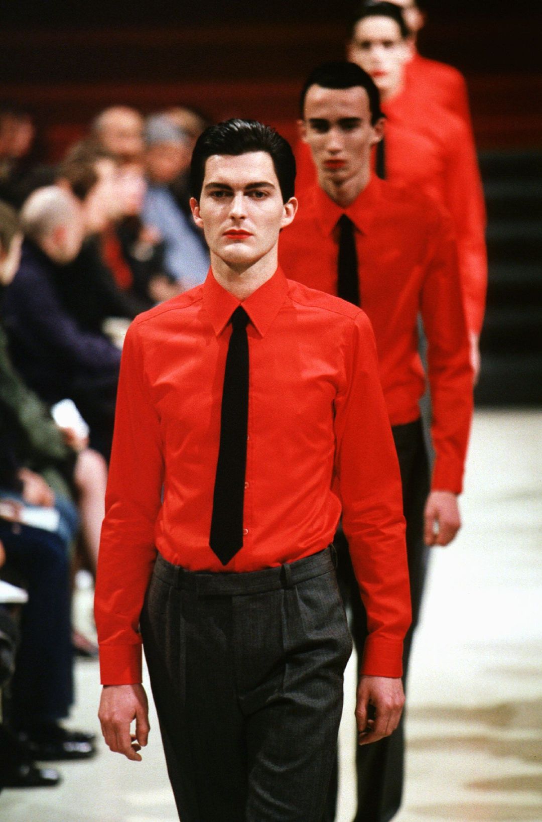 紧随其后的 1998 秋冬「Radioactivity」系列,Raf 儿时倾慕的德国电子音乐团体 Kraftwerk 的成员,身穿标志性的红色衬衫,打着黑色领带出现在了当季的秀场上。成为了随心所欲的 Raf Simons 又一场极度私人化的系列,主角从街头游荡的青年群体的「他」,变为了比利时内佩尔特小城的「我」。McQueen 曾经提到过,他的每一季秀场都是一部关于个人的自传,这同样可以用来形容 Raf Simons 的早期系列,「这与时尚无关,只是与音乐有关」,在此后的一次采访中,他谈到 98 秋冬系列时说到。细窄的衬衫领,侧梳的发型,形销骨立的身材,几乎等同于一个完整公式的男装形象,会在即将到来的新千禧年初期占据主流,Raf Simons 则是这一形象的「始作俑者」,正如纽约时报给予他的颇具分量的评价:「Raf Simons 定义了 21 世纪初的男装时尚。」而那一季系列之前,他刚刚度过了自己的三十岁生日。