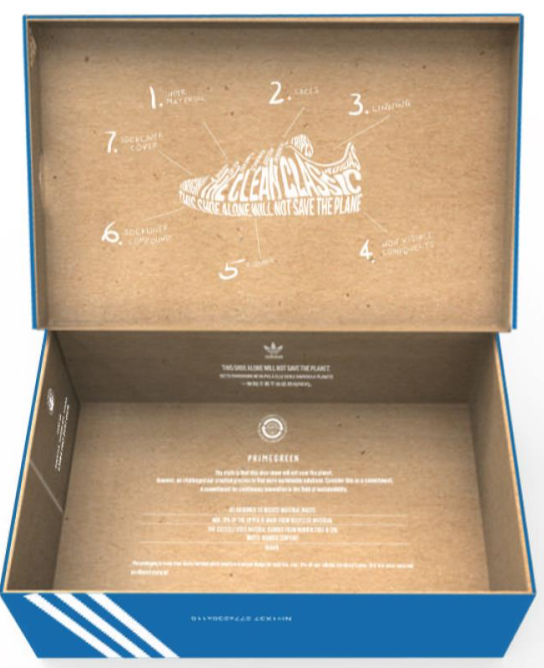 为了践行从鞋款到包装的环保理念,adidas 将以往的废旧鞋盒与此前由于印刷错误而搁置的剩余库存材料再次利用,并随机进行裁切,打造出每一个印刷图案都不同的全新鞋盒。鞋盒的内部也附有 Sustainability 的环保理念及鞋款的环保材料构成,这种既环保又充满 DIY 的创意设计无疑会吸引更多年轻人加入到「可持续」阵营中来。