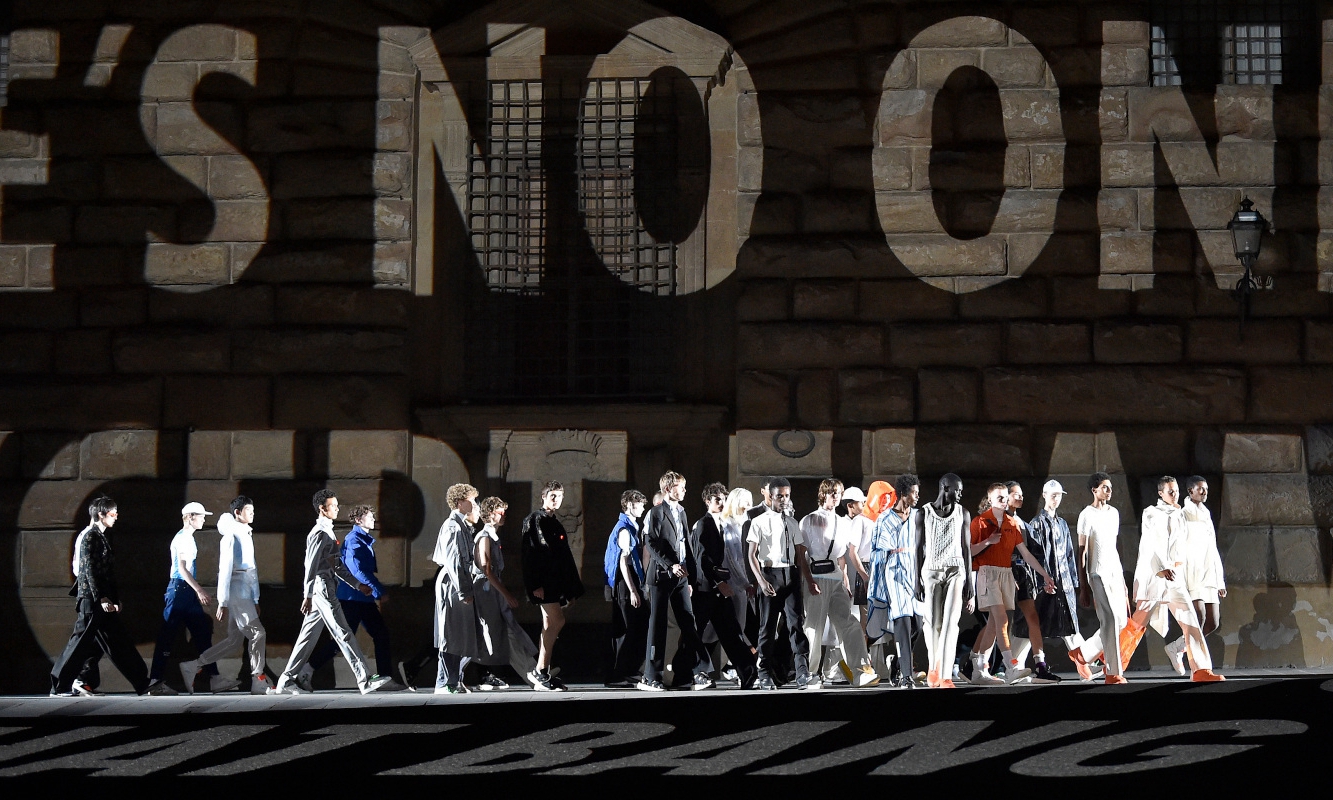 Virgil Abloh 与艺术家 Jenny Holzer 在 2017 年 Pitti Uomo 男装展 Off-White™ 秀场展开合作