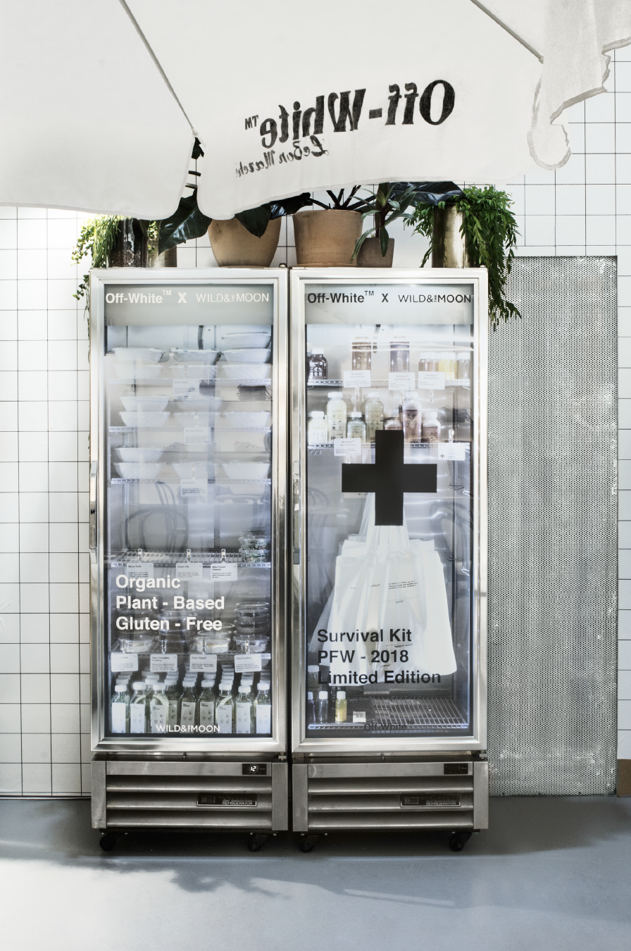 在 2018 年初巴黎时装周揭幕前,Virgil Abloh 携手巴黎健康食品餐厅 Wild&the Moon 开办 Pop Up 限定咖啡厅,为即将到来的 Off-White™ 新季作品「预热」。在 Off-White™ x Wild&the Moon Pop Up 限定咖啡厅中售卖的商品包括「Blue Magic」饮料、抹茶口味的爆米花、以时装周「survival kit」特殊套装形式亮相的饮料组合。同样,Virgil Abloh 亦是此次 Off-White™ x Wild&the Moon Pop Up 限定咖啡厅商品视觉设计的领军人物。
