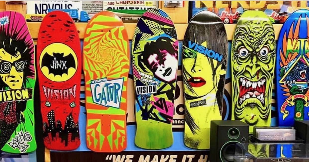1970 年代末,Skateboard Deck(滑板板面)成为 Vision Skateboards 的主要产品。此后,Vision Skateboards 与许多艺术家合作,在板体上推出了很多极富创造力设计作品,不仅在颜色上极具冲击力,具有迷幻视觉效果的「 Vision Gator」漩涡图案设计,也成为品牌迄今为止最经典的艺术元素。