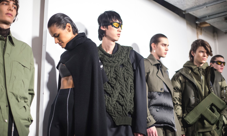 王逢陈:你可以看到服装有一个特别的茶绿色,它不是很鲜艳的绿色。福建有一种很有名的茶铁观音,就是茶绿色。另外,福建是丘陵地带,有山有水,这些元素也很鲜明的体现在这系列服装上。当然,也少不了 Feng Chen Wang 一些很经典的元素,比如说一些在构造上、层次上、功能性上的设计,从而才使得我们最终呈现了一个很好的效果。