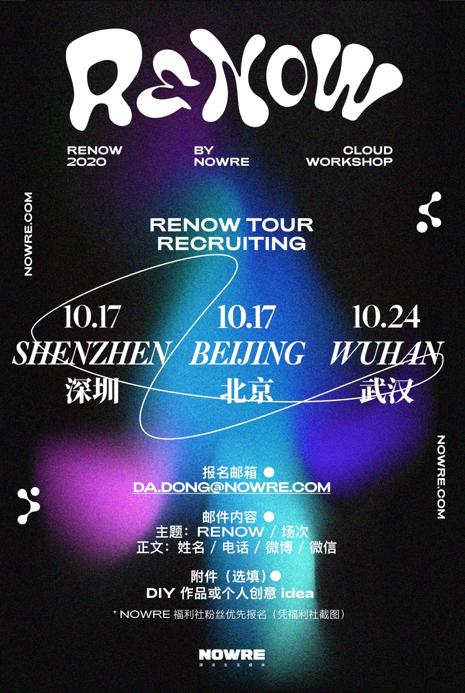 十月已至,「RENOW」巡回 Workshop 亦将再起新章——本次,NOWRE现客将联合深圳 DOE 、摩登天空旗下视觉创意厂牌 MVM 以及「老朋友」101 时尚工厂,在深圳、北京及武汉开启「RENOW」的第三段巡回旅程。
