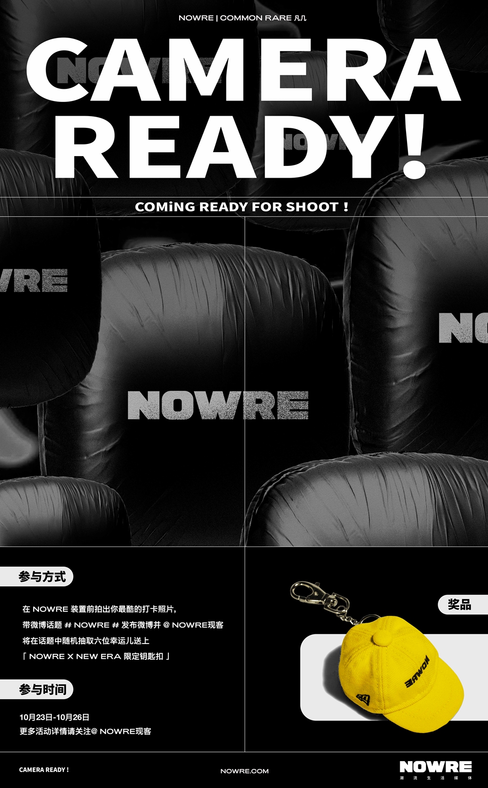 值得一提的是,这一次我们更带来全新互动玩法——「Camera Ready」。在NOWRE现客「SHOW AND TELL」3.0 活动装置前,拍出最具个人「潮流 DNA」的打卡照片,带微博话题#NOWRE#发布微博、并@NOWRE现客 官方微博,我们将在活动参与者中随机抽取六位「幸运儿」,送上 NOWRE与 New Era 合作打造的限定帽款钥匙扣周边。