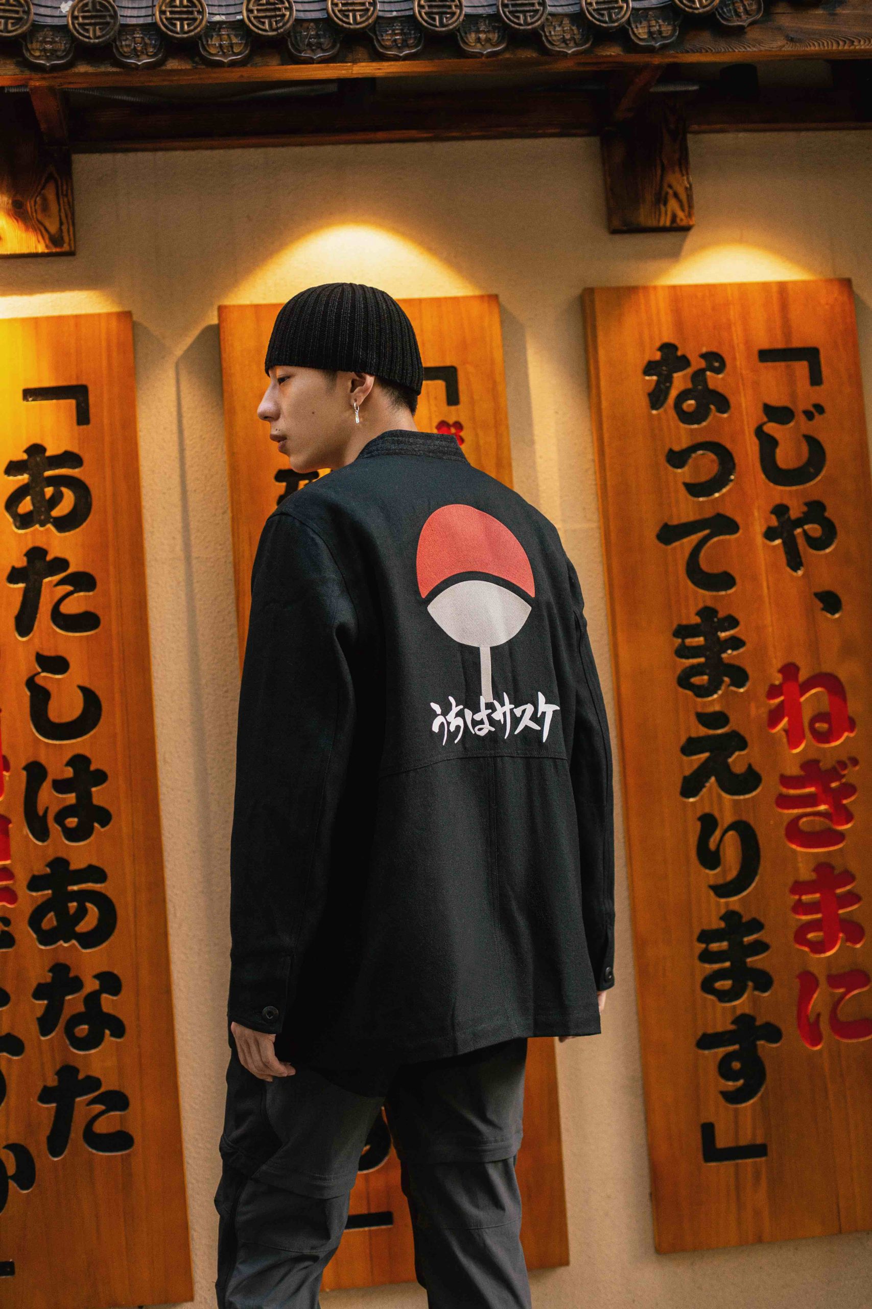 然而更加巧妙的是在于「道袍」这样的款式,除了是《火影忍者》动漫中最为人印象深刻的一种日式传统服装以外,在潮流时尚领域里面也是近年流行趋势下的热门单品。PEACEBIRD MEN 便选择了在道袍的设计上加以改良,除了融入类似工装夹克的口袋以及纽扣设计以外,更将《火影忍者》里大家再熟悉不过的「宇智波」标志放在背面,一脉相承于动漫中「宇智波一族」的经典形象,从动漫中提炼出标志元素并合理转移到现实服饰的设计当中。
