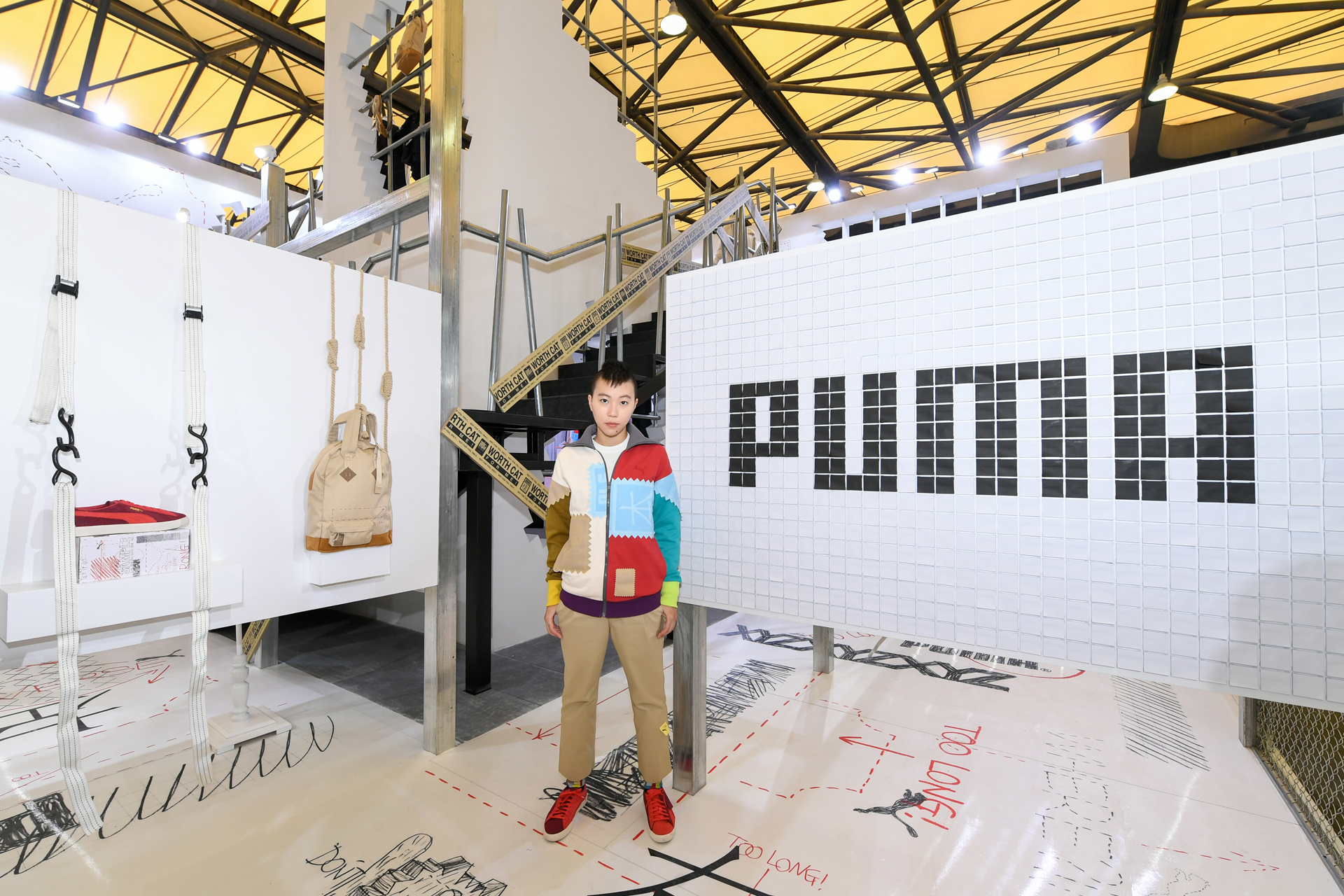置身于「试错工作室」,随处可见 Michael Lau 标志性的 WORTH CAT 玩偶形象和「SAMPLE 样本」设计元素,而 Michael Lau 的「创作手稿」也以涂鸦和拼接解构的手法在现场得以重现,整个展区像是一件未完成的施工现场,也与本次的主题和谐一致。