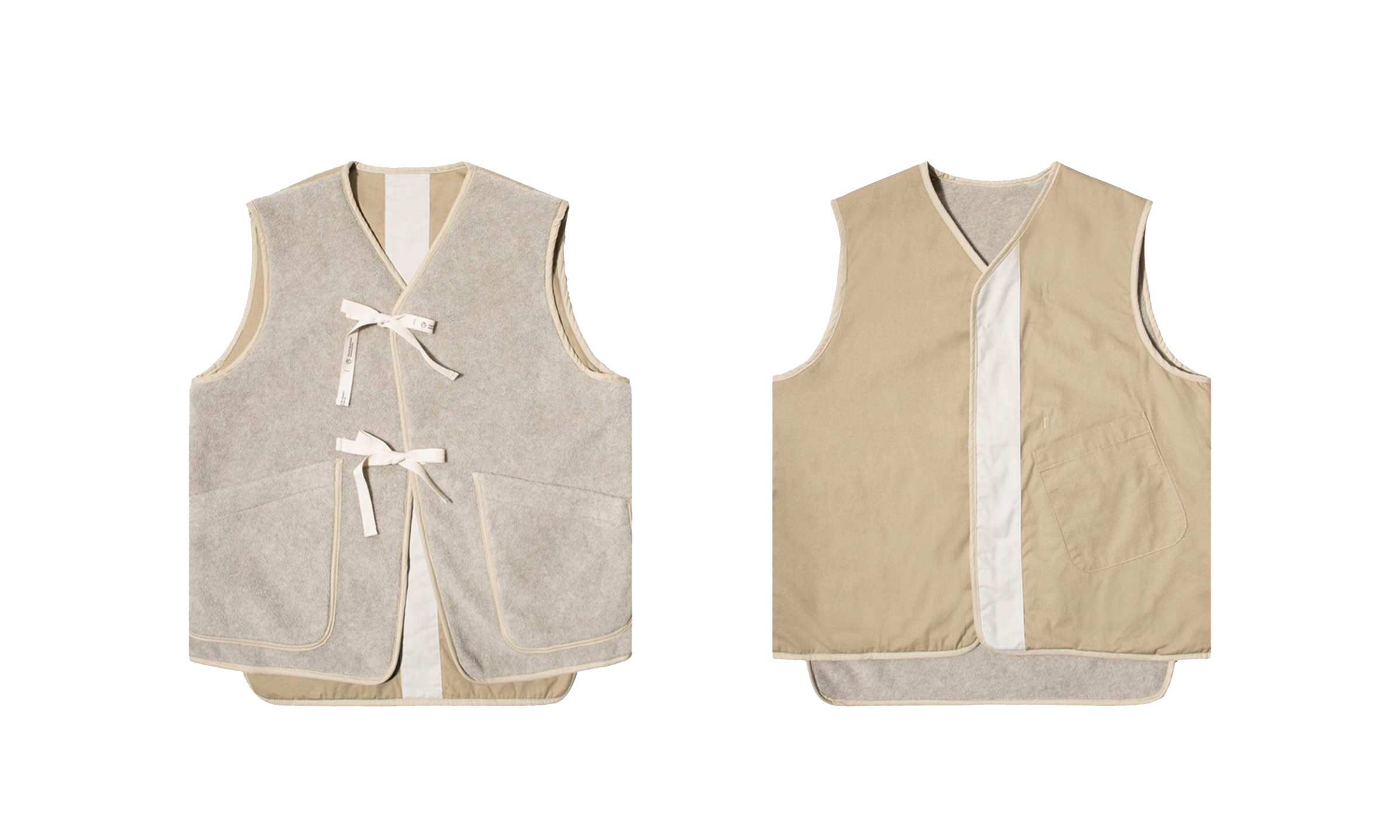 小林节正赋予这款单品简约的色彩搭配与双面可穿戴功能,选择以夹克背心展开创作,则是基于这款单品既可内穿、亦可以当做外衣搭配的多功能属性,为消费者提供了更为丰富的搭配选择。这款 MT Vest 选择以绳结进行衔接左、右部分处理,这一设计创意上的巧思,令整件单品的实用性与设计感达到相对的平衡,使之成为一款既好穿、又有趣的设计。