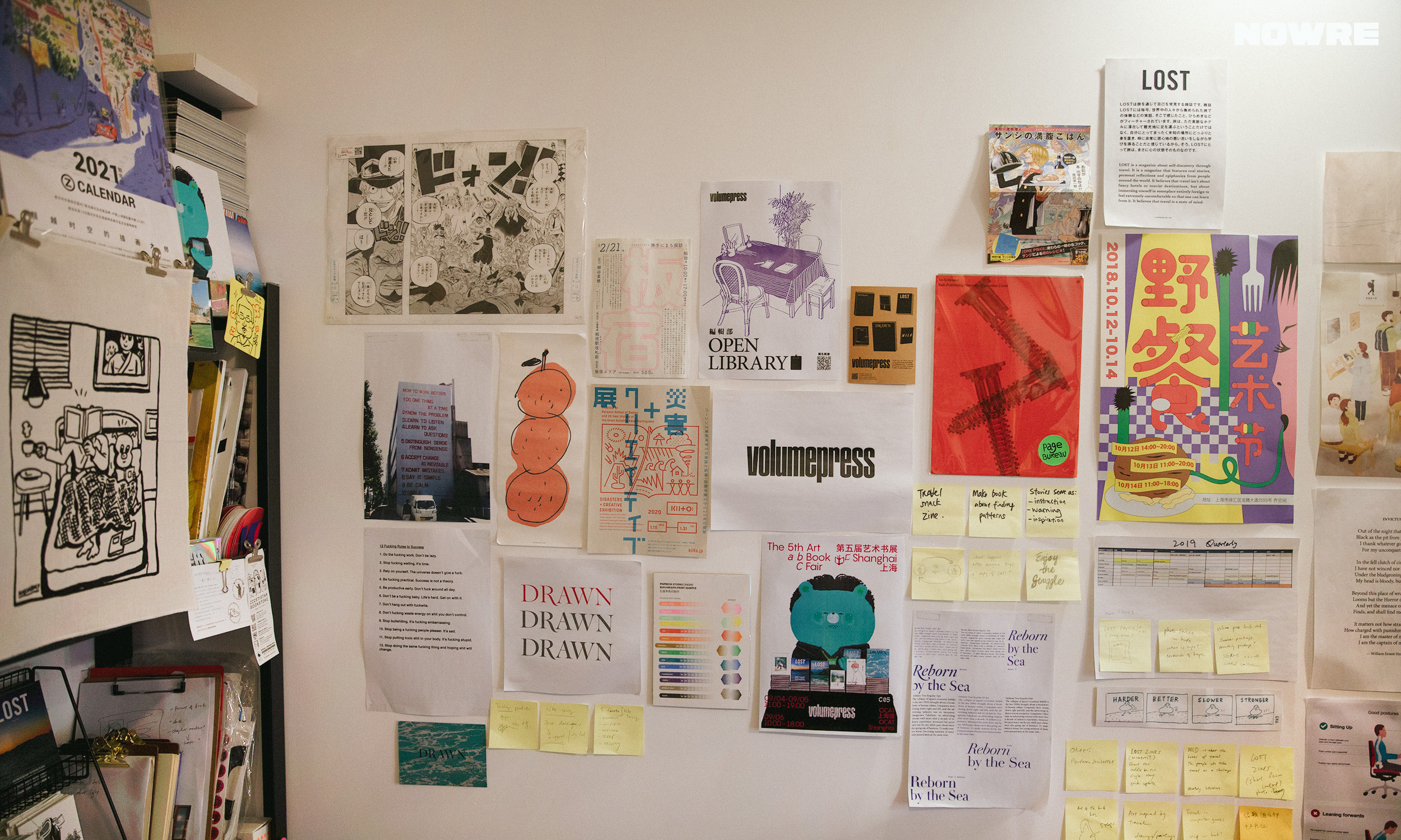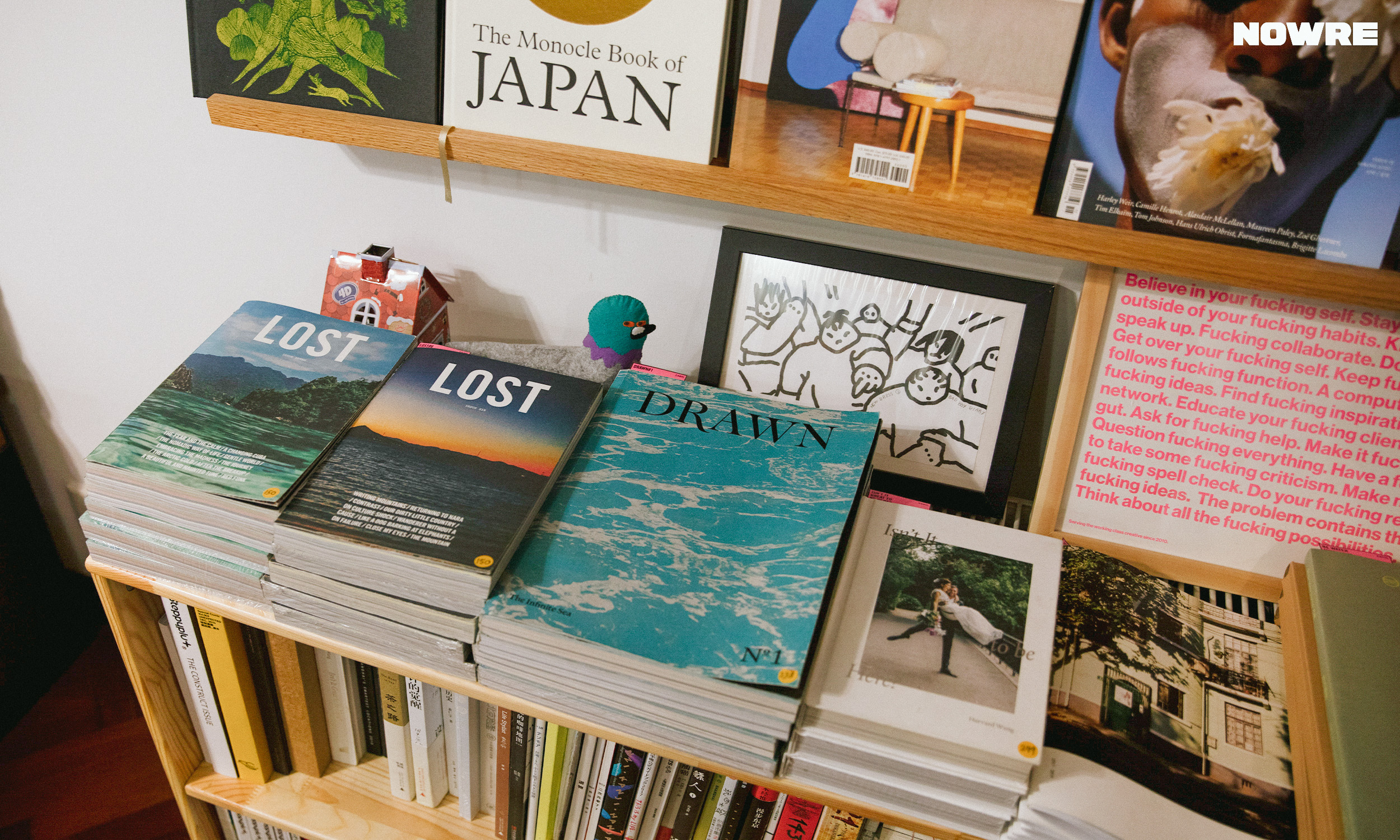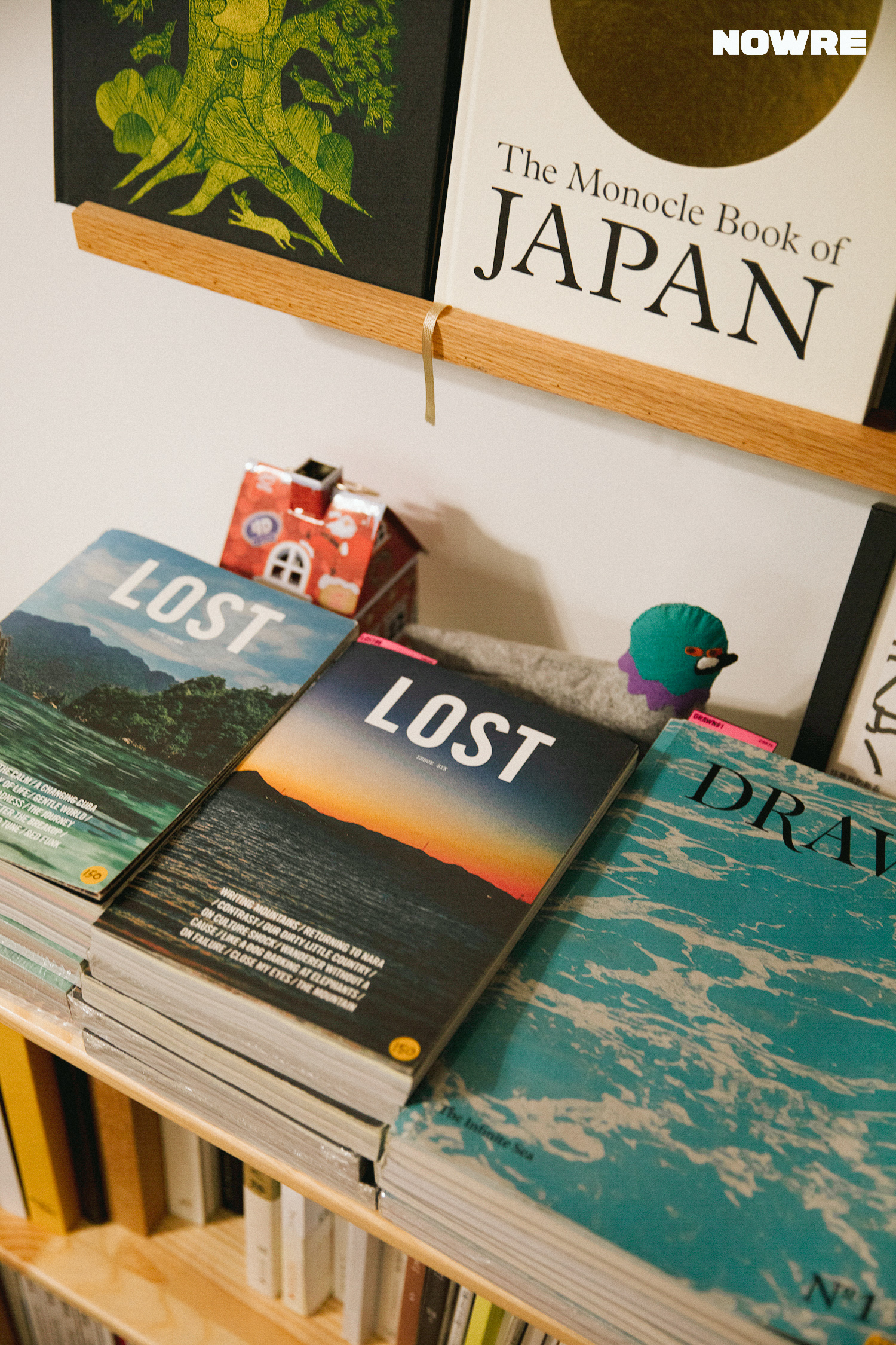 这里不仅仅是每一期《LOST》诞生的地方,也是 Nelson 的出版工作室「Volume Press」。除了《LOST》以外,各种各样的创意刊物填满了屋内的整面书架。当望向 Nelson 的工作区域时,你能看到工作桌一旁的墙上更是贴满了杂七杂八的海报、便条、明信片、灵感素材…… 这里没有开阔亮堂的办公环境,只有在简单温暖的氛围之下飘荡在小屋中的一个又一个创意灵感。