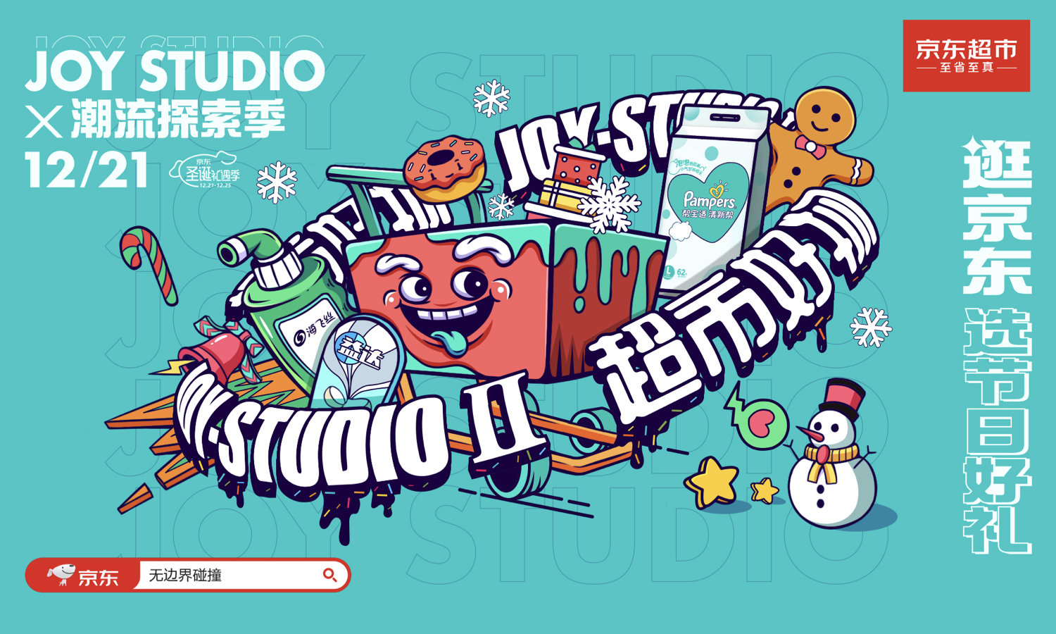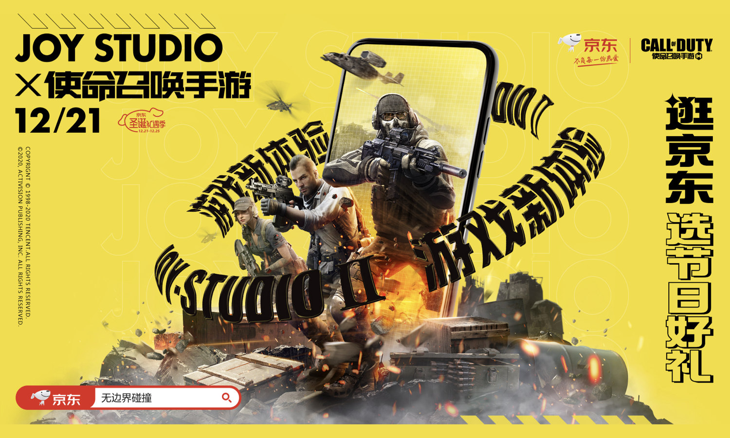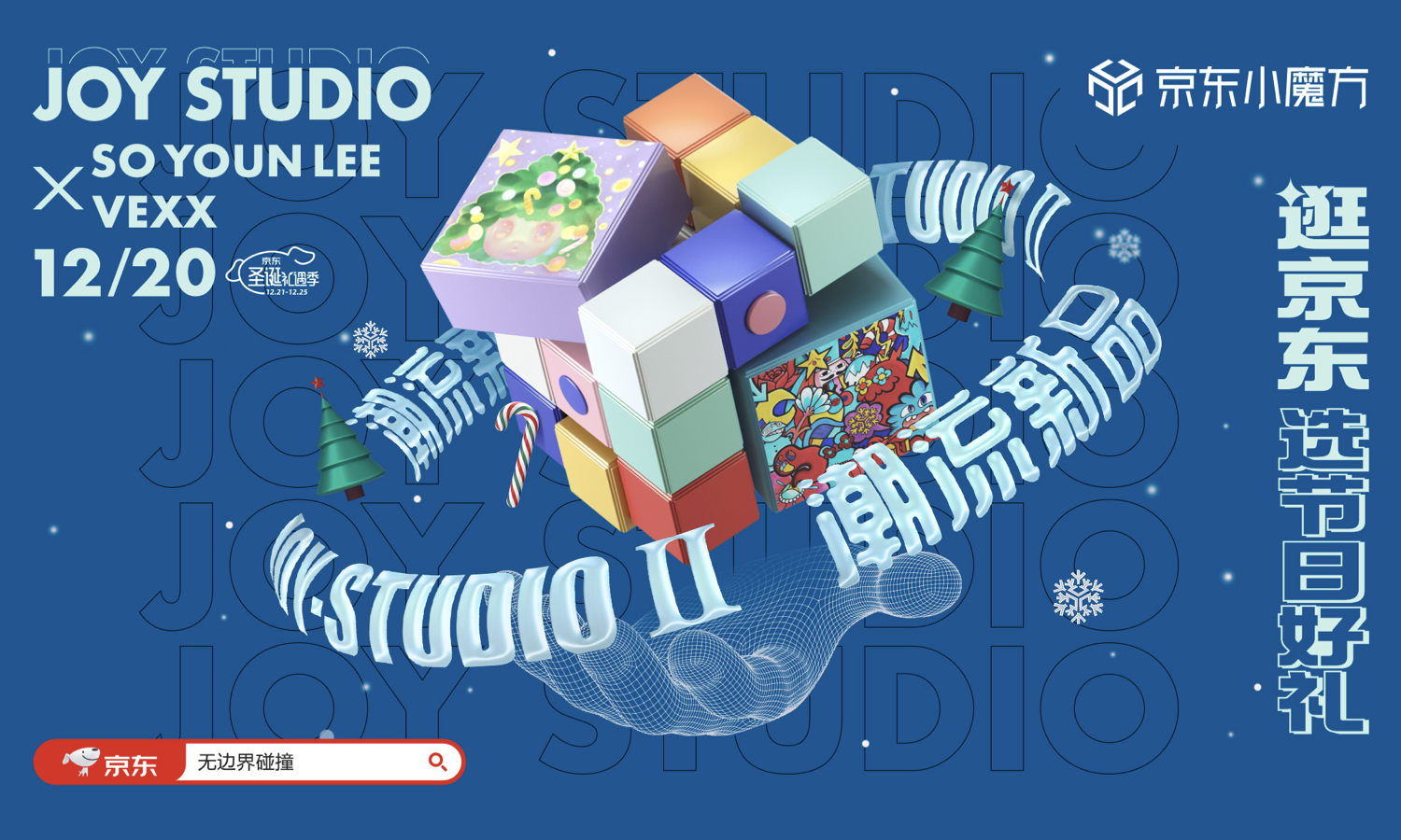 该六大选物法则是基于 JOY STUDIO 第二波的超级 IP 日,旨在圣诞节前夕召集全城人类「选好物」。下面为各位揭晓神秘活动玩法:即日起至 12 月 25 日,打开京东 app,搜索「无边界碰撞」或者「摇一摇」手机参与互动,即可到达活动会场,挑选圣诞好礼,12 月 21 日起,在 IP 会场购买指定圣诞好礼满 499 元,有机会获得 DIMOO × 京东 JOY 手办;另外凡是购买小魔方新品礼盒就有机会获得潮流艺术家的联名拼图。