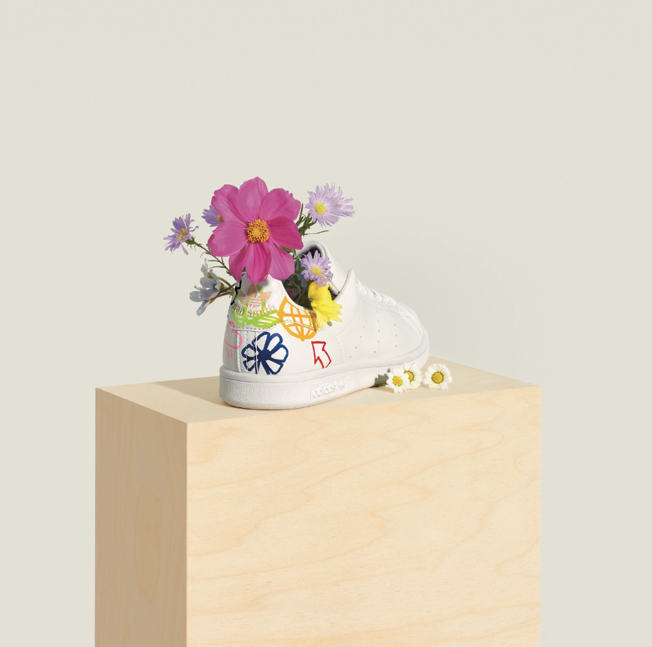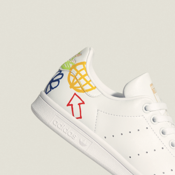 既然是纯素时尚,那么 FX5679 和 FX5653 两款插画风格鞋款就成为本系列中最为亮眼的存在。鞋身上稚嫩拙朴的笔触,搭配鲜亮饱满的色彩,为我们勾勒出地球、花朵和经典的三叶草图案,在一双球鞋之上,展现了来自于地球和大自然的生命力。