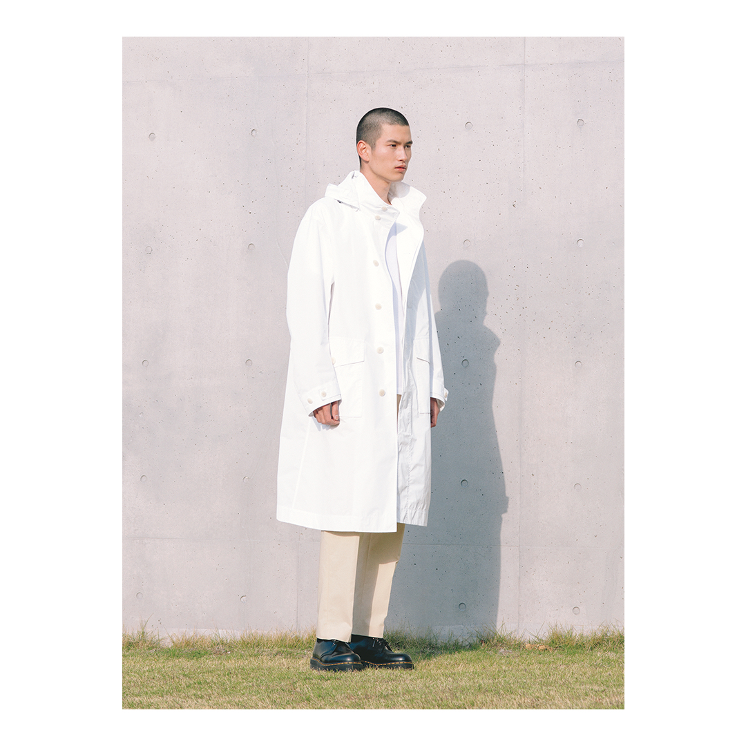+J 一向以精准剪裁著称,这个系列的男装在剪裁上也别具一格。宽松连帽大衣,采用精致的 3D 剪裁,虽是大衣却毫无厚重感,体现出 +J 对细节的追求与讲究。