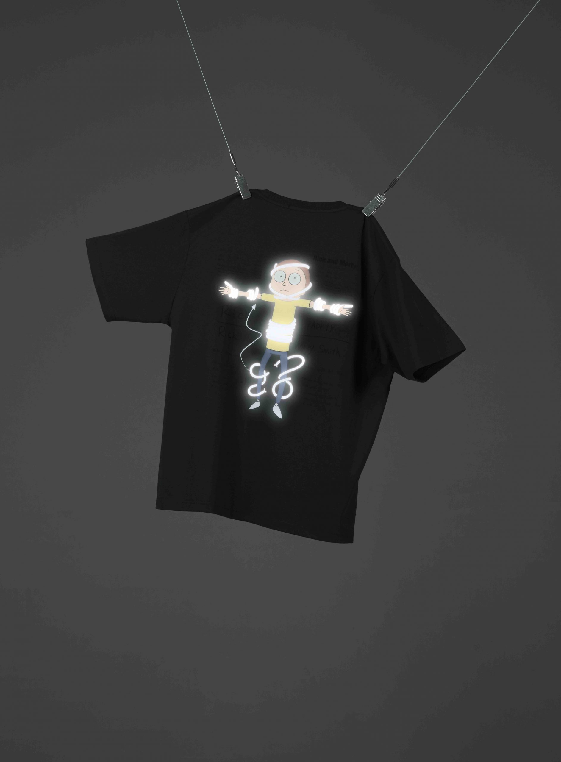 此外,这个系列反光材料的使用是联名系列中最大的亮点之一,《Rick and Morty》中的动画形象,配合异形字母和脑洞印花,反光单品在黑暗环境中表现出另一番「面孔」,也赋予了满满的科技感和魔幻玩趣属性。
