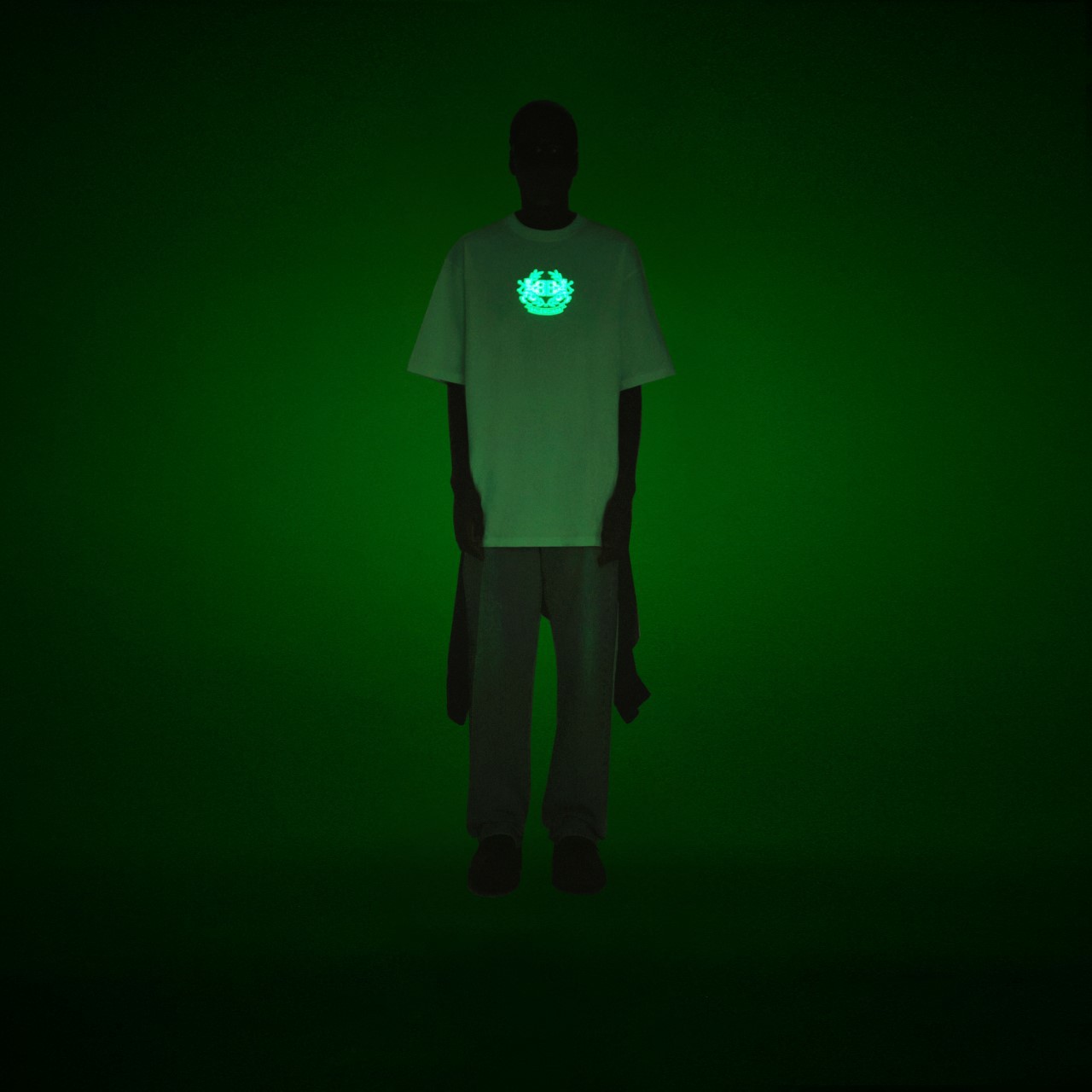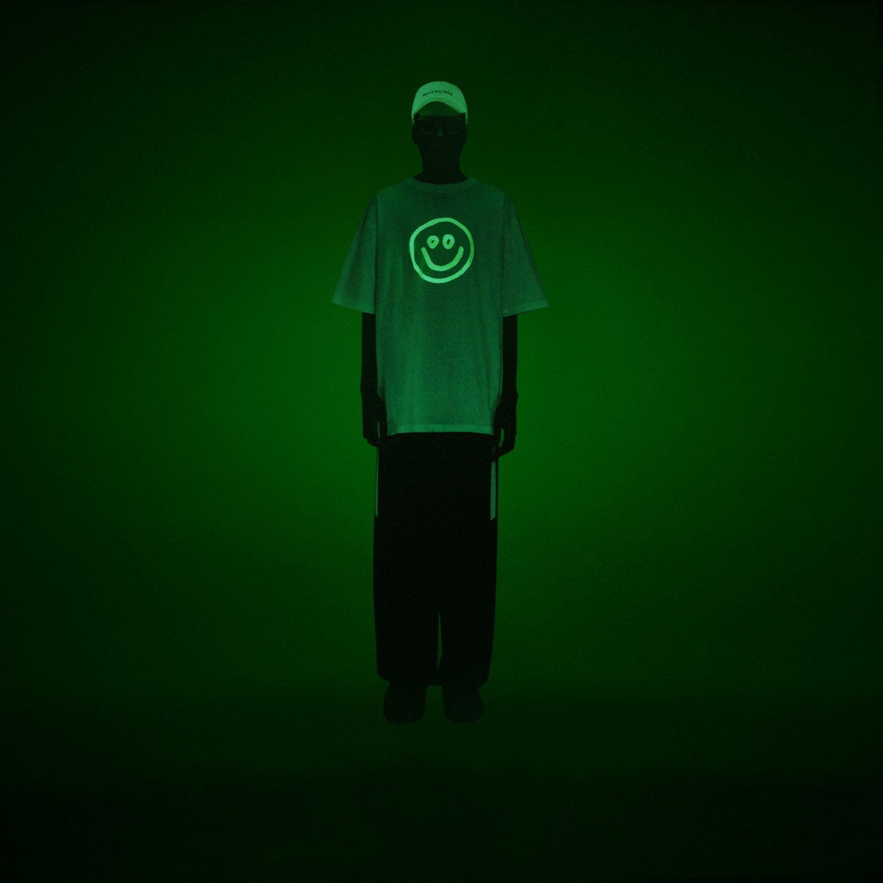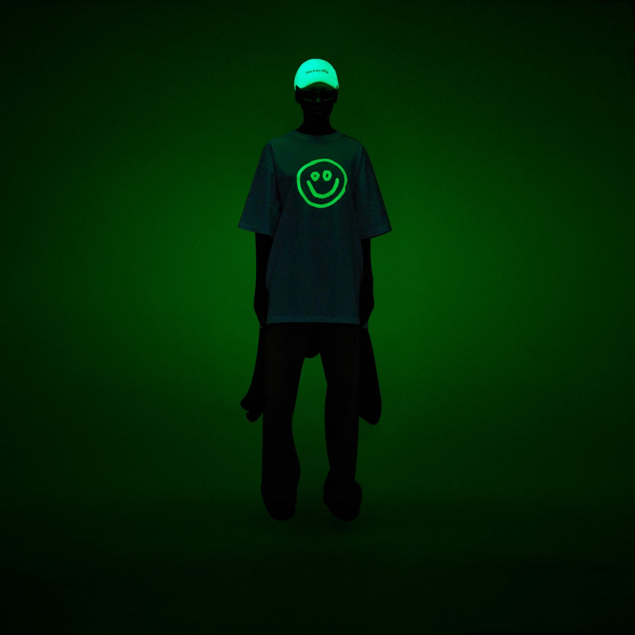 此次 BALENCIAGA「夜光精灵」系列共带来了包含 T 恤、Neo Classic Used 做旧版手袋、Track 穆勒运动鞋、Track 登山靴在内的重量级单品,笑脸图案的标识点缀于 T 恤单品之上。而为了表现出荧光的视觉效果,系列 T 恤的组成材料,加入了磷光粉末与纤维材质的混合(磷是一种可在自然光下吸取能量,并在黑暗中发光的材质),使其在光源稍暗处达到荧光的效果。而俱乐部场景可谓是「夜光精灵」系列单品最为贴切的展示空间,舞池之内,迷幻的荧光视觉冲击,与辨识度极高的笑脸 Logo,配合着 Club Kids 的舞步,不仅衬托着舞台主角的光芒,更是对自我身份的强势宣言。