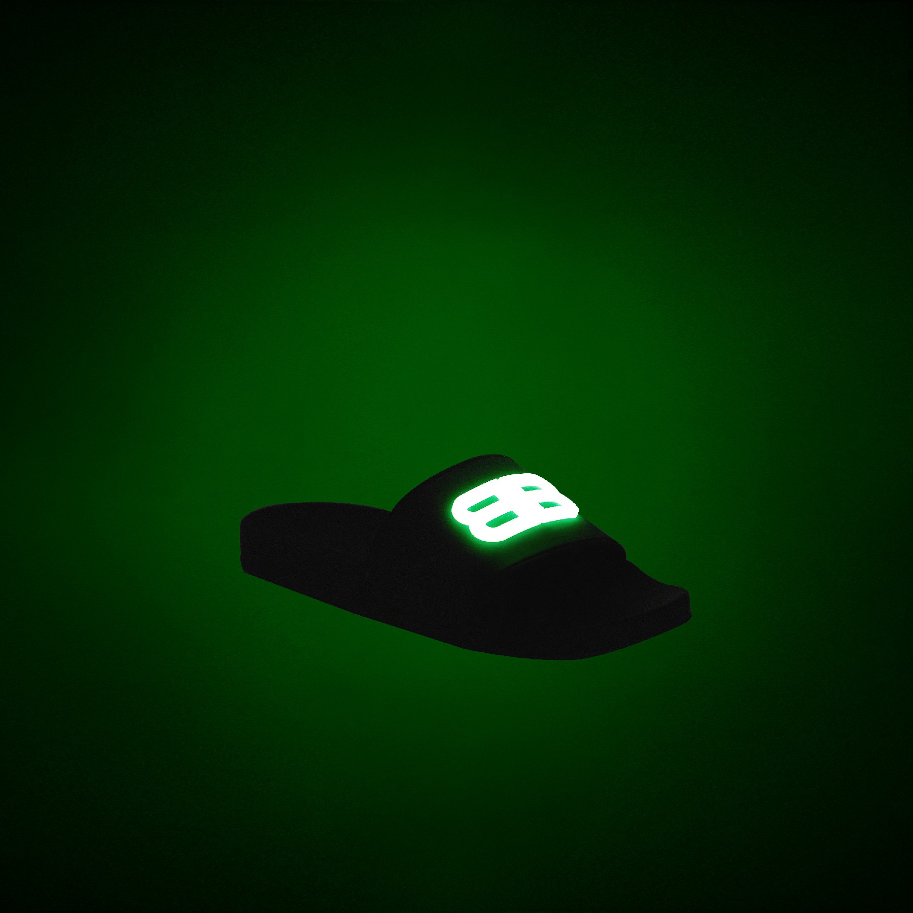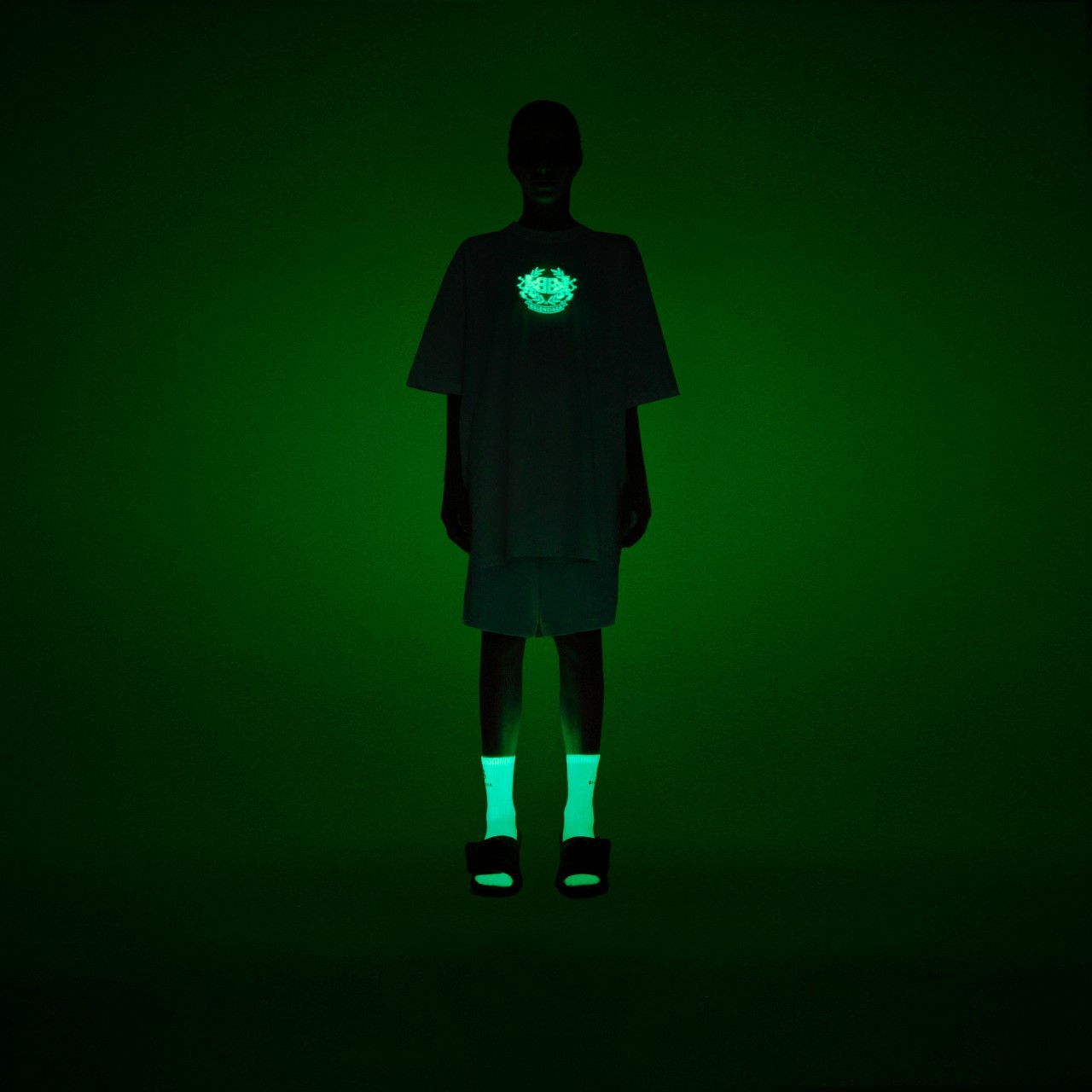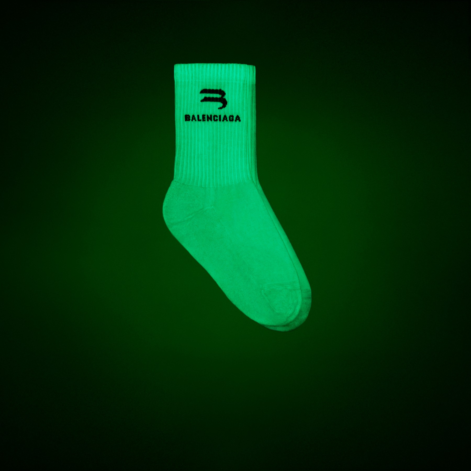 此外,在配饰层面,BALENCIAGA 全新的狮子月桂叶双 B 标识出现在袜款、泳池拖鞋单品上,经过光线充分照射吸足光源后, 同样能够在黑暗中呈现夜光效果。
