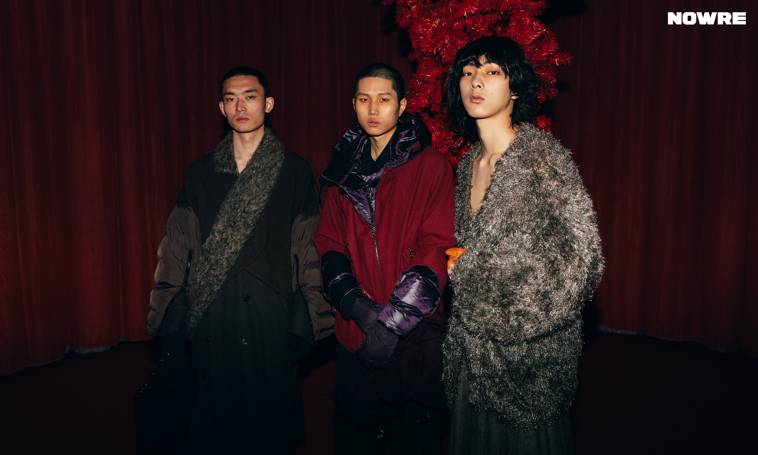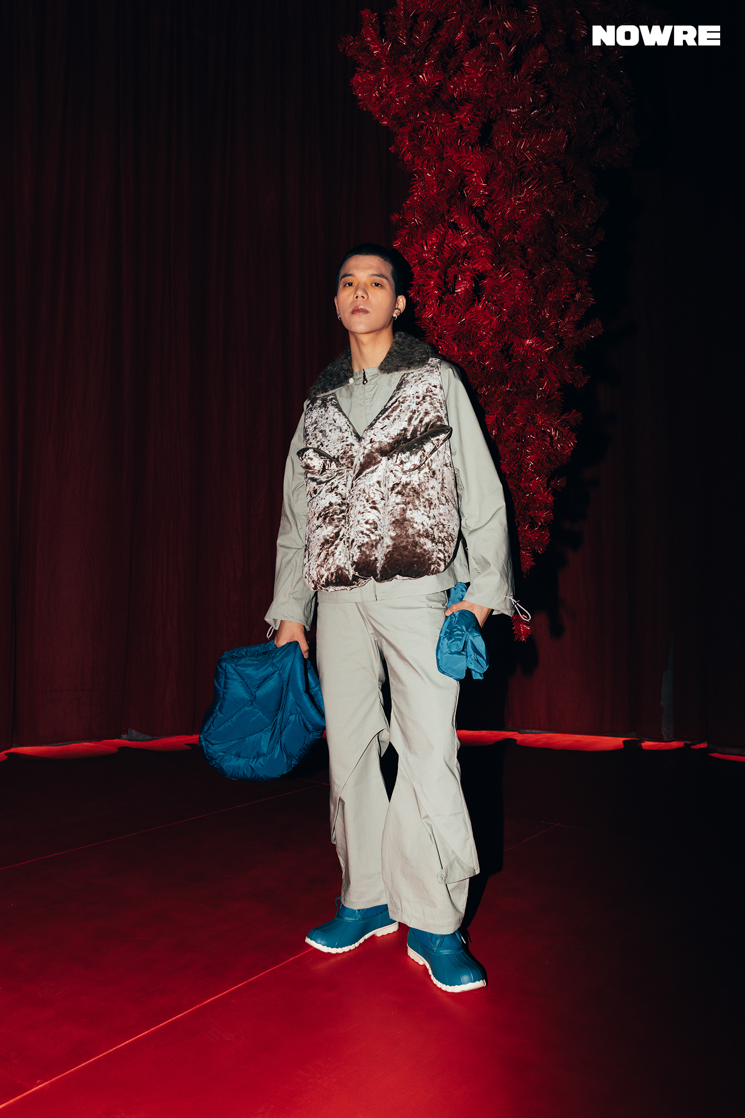 一群少年在林中守护着的毛茸茸大脚怪,湖边的水鬼等经典形象成为原型,通过面料收褶和大块面处理工艺,扭曲化、象形化的剪裁和线条,去体现充绒玩偶版的稚气和怪奇的设计语言。将大量猛犸象与因纽特人般的长绒毛和充绒后轻薄且具钟乳石光泽的户外面料进行杂糅,融合做旧后的蕾丝,最终营造出了童年的美梦奇异。