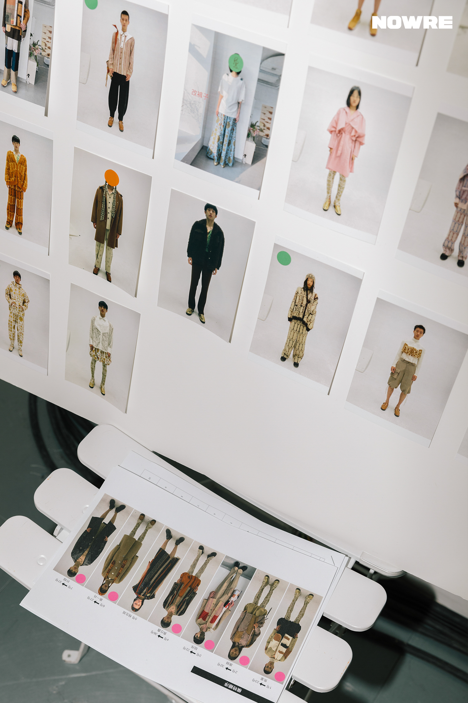 除了在当天的紧张演练外,一场时装秀通常需要提早数月进行准备工作,GARÇON BY GARÇON 的设计团队早已提前确定了从服装、鞋履、配饰到发型妆容的选择与搭配。他们为每个 Look 进行编号,为模特拍摄试装照,列出他们将会穿着的单品,标注款式说明和注释,并将其标识于后台的明显位置。