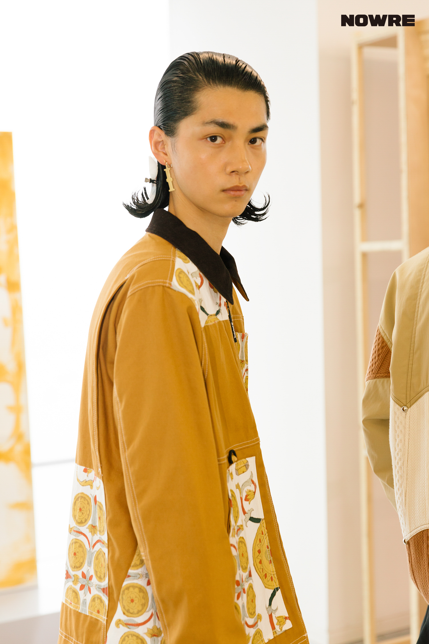 走进 GARÇON BY GARÇON 的秀场后台,我们看到了真实发生的场景与更加多面的视觉呈现。就好像本季以自然万物之源的太阳为题,在服饰系列里形象表达着太阳光芒的放射状态,着色上既有炽热的大地色泽,有蔓延至火苗燃烧的红、亦有大地映出的蓝与绿,而在多样的呈现中,我们所看见的,一如设计师 Dayun Tang 所言,是那位脆弱又坚强的「戛赫松少年」。