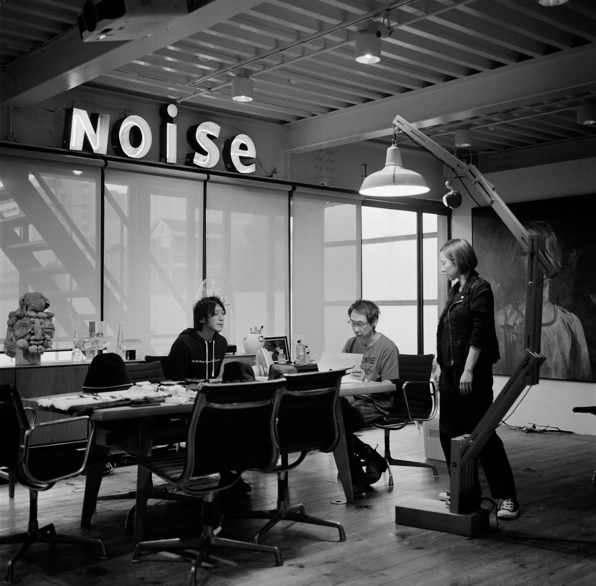 整个工作室大楼,像一个波纹状的黑色金属盒,而它正下方的空间,是昔日东京一处隐秘的地下音乐场所,美国歌手 Patti Smith 曾在这里演出,如今,它成为了 UNDERCOVER 团队裁剪服饰的地方。Eugene Rabkin 曾于 2020 年 5 月发表在《032c》上的一篇专题中,提到了 UNDERCOVER 里原宿工作室的种种细节。其总部大门的黑色金属把手,在「Undercover Laboratories」字样上方刻有着十字骨架和闪电的标志,而高桥盾的办公室则占据了整个顶层空间,门旁挂着 Anarchy 的标志,代表无政府主义的霓虹灯,书架上摆放着《发条橙》和《闪灵》的书籍、唱片和小型雕像装置;两个巨大的复古 Altec Lansing 扬声器位于他的办公桌对面,其侧边出现了一个大型的 Grace 玩偶;一处完整的 DJ 装置上部,分列着以灯牌制作的 Noise 单词(噪音)。