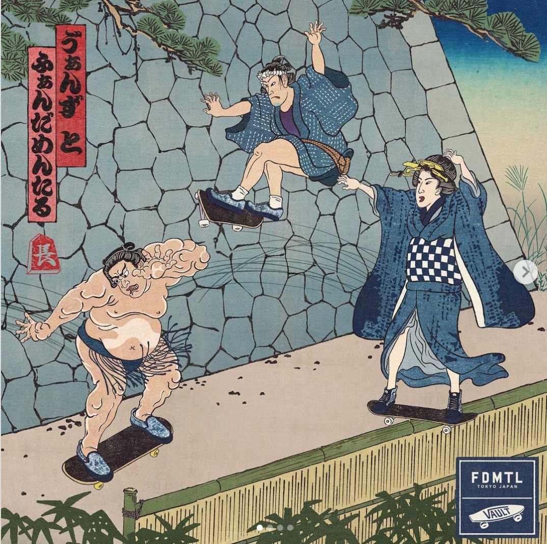 同时这次联名双方邀请了东京插画家 NAGA 通过插画的形式结合了 Vans 品牌文化中的滑板基因,重现江户时代的浮世绘风采。插画中呈现了三种不同职业的形象:相扑手、工匠以及经典的和服形象,人物脚下皆穿着本回联名系列鞋款做出滑板动作。