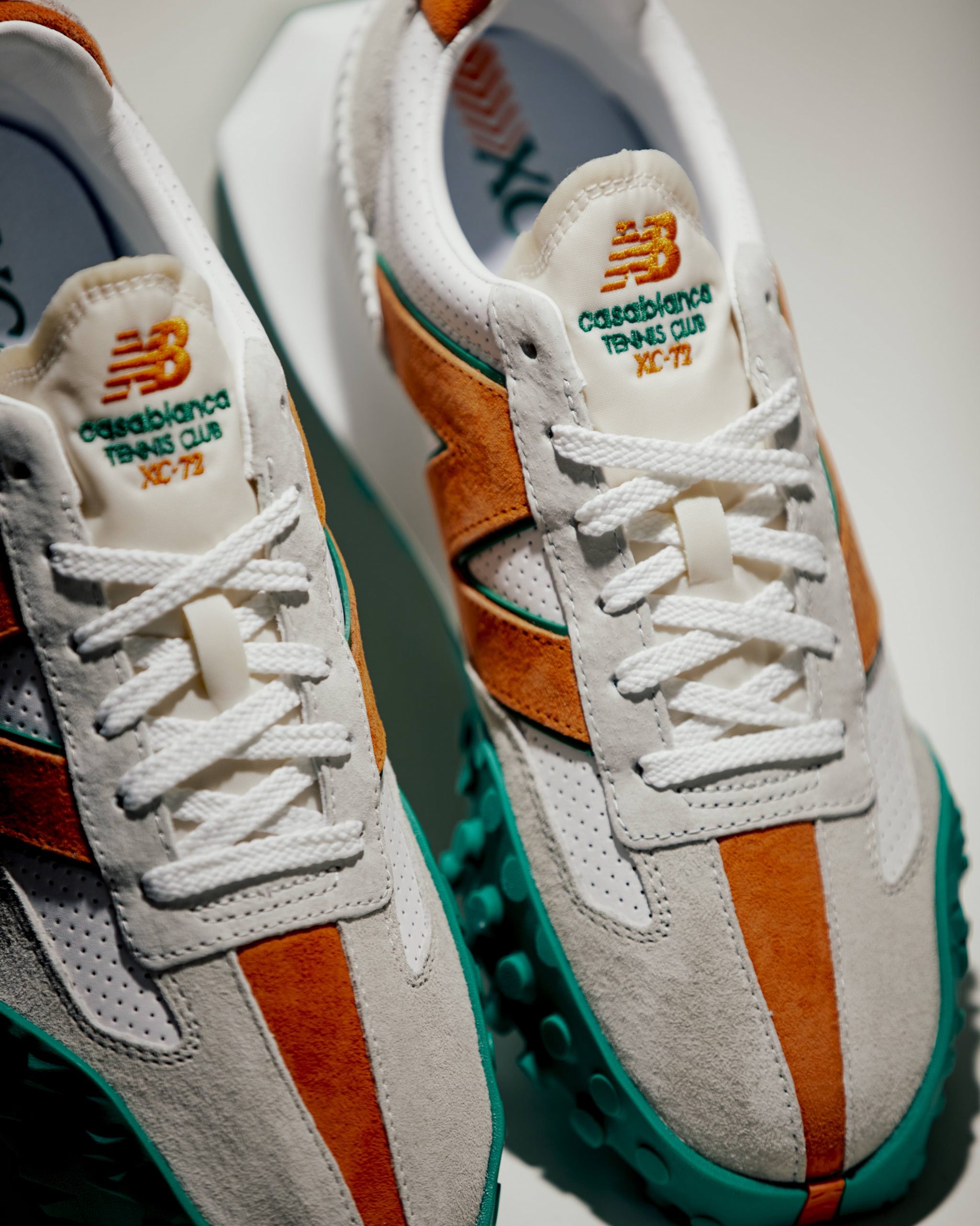 New Balance x Casablanca XC-72 首波亮相的两款配色也非常抢眼。一为澄橘和草绿,以白色透气网纹拼接灰色麂皮,延续 New Balance x Casablanca 第一代联名鞋的经典外观。另一双则使用大胆红黄配色,再以黑、白点缀鞋身,取自跑车轮胎的黑色大底,并搭配XC-72独有的鸳鸯刻纹设计,更使豪华跑车的概念更活灵活现。
