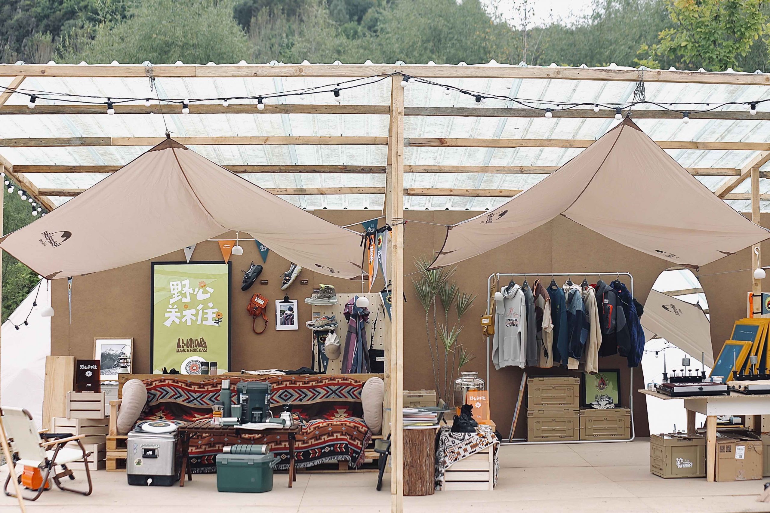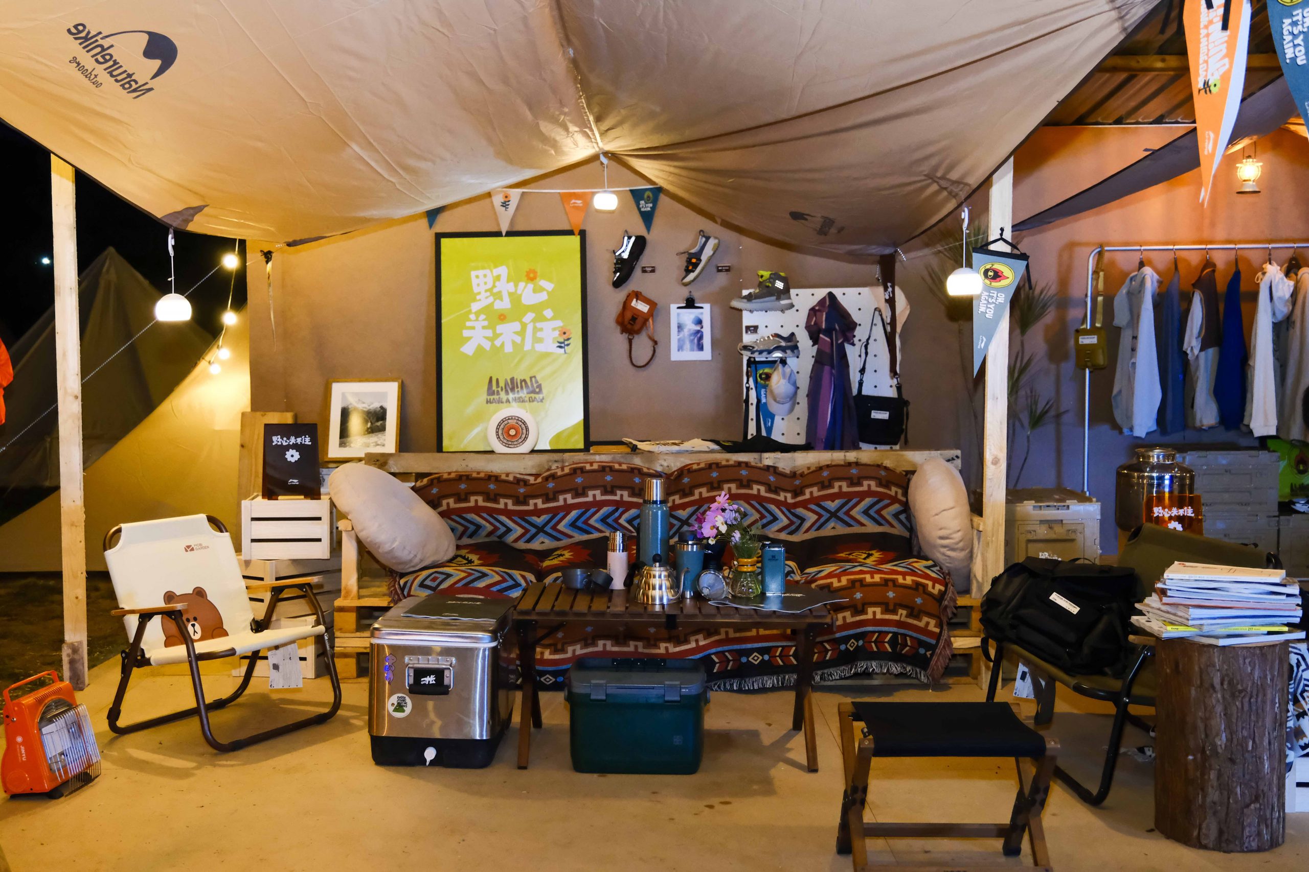 大家相互交流,一杯手磨咖啡,夹杂着大地的原始芬芳,也显得更加回味无穷。相比传统露营,这次显然增添了新玩法。李宁在现场特别打造了「野心关不住」主题品牌户外美学区,将过去与户外生活联系颇少的家居氛围场景带到了现场,结合都市户外生活方式进行全面展现出户外露营更精致的一面。