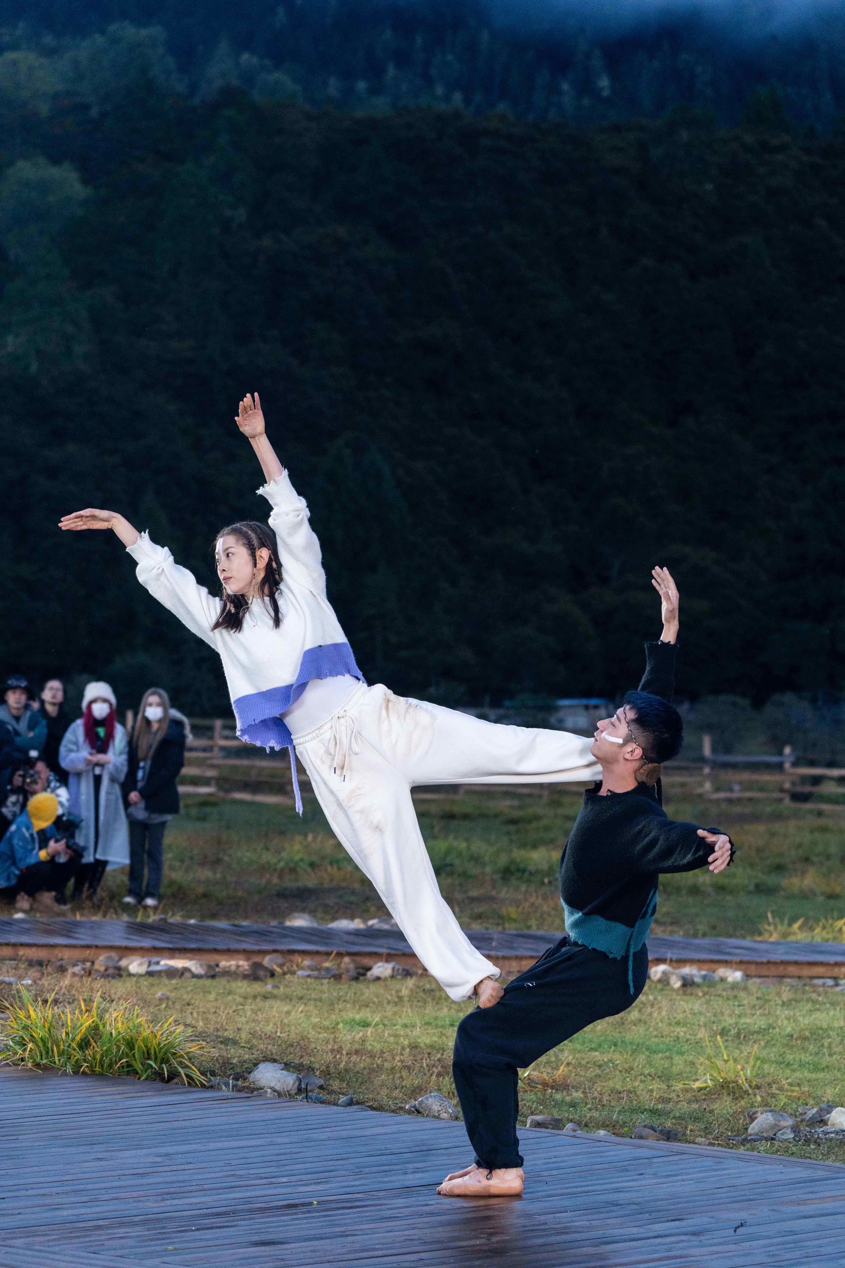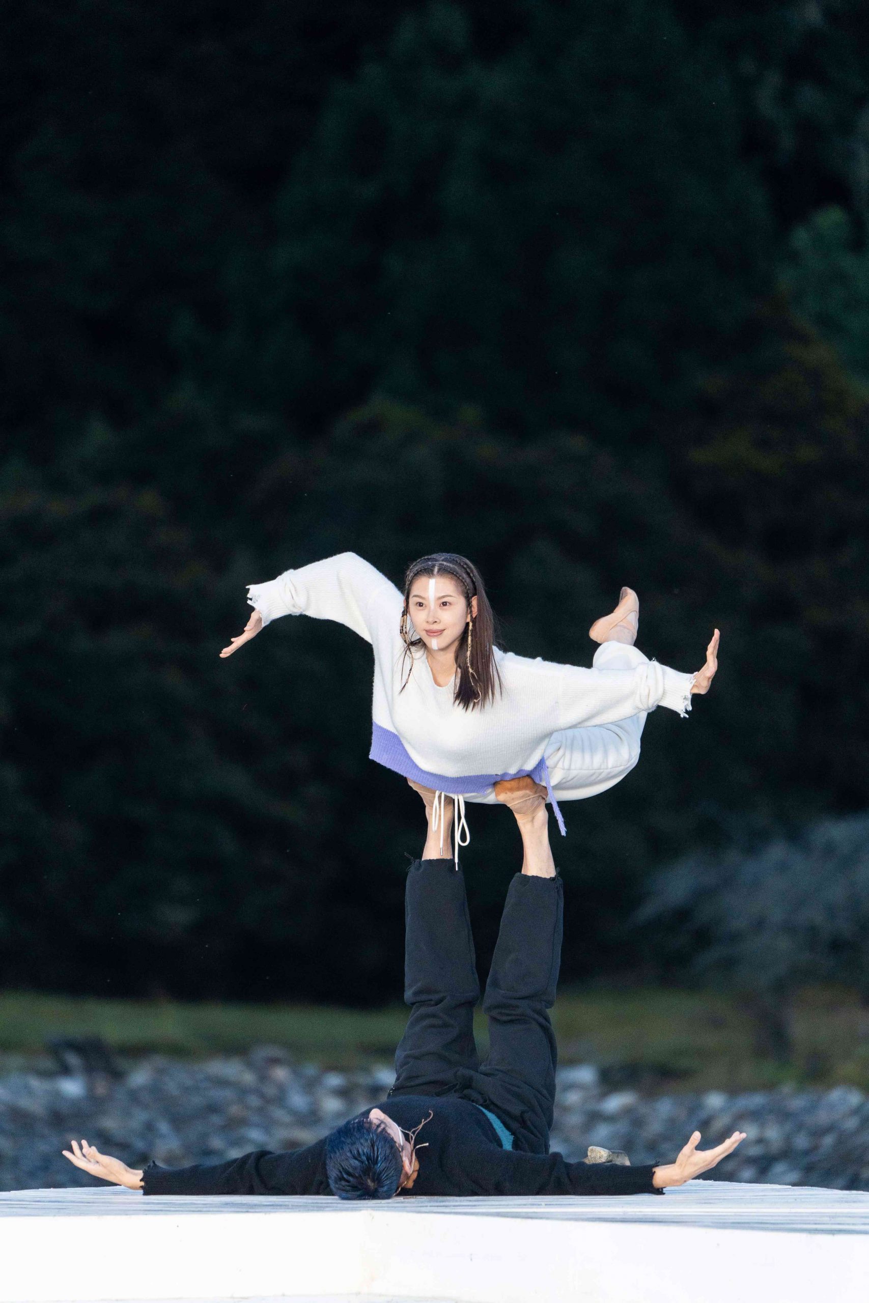 大秀以天地为背景,借助雪山自然景色在现场搭建起三角形的回环构图。选择此地,也是寓意积蓄的生命之力不断迸发,也展示着对「悟行」的思考,永远眺望山顶并以其为终点。